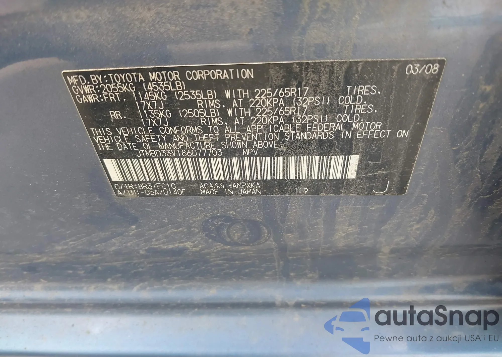 LOT: 42345941 VIN: JTMBD33V186077703
