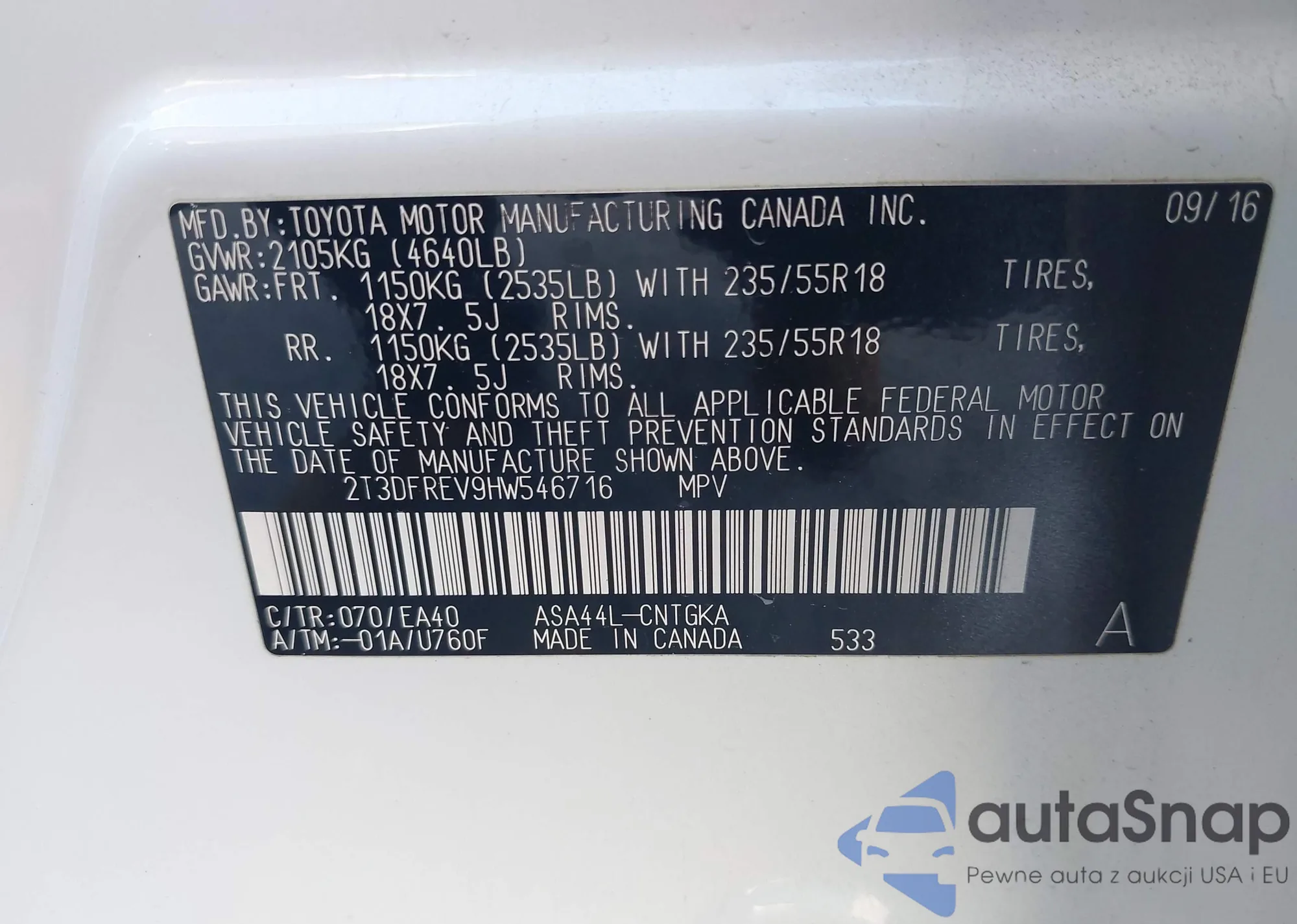 • VIN 2T3DFREV9HW546716