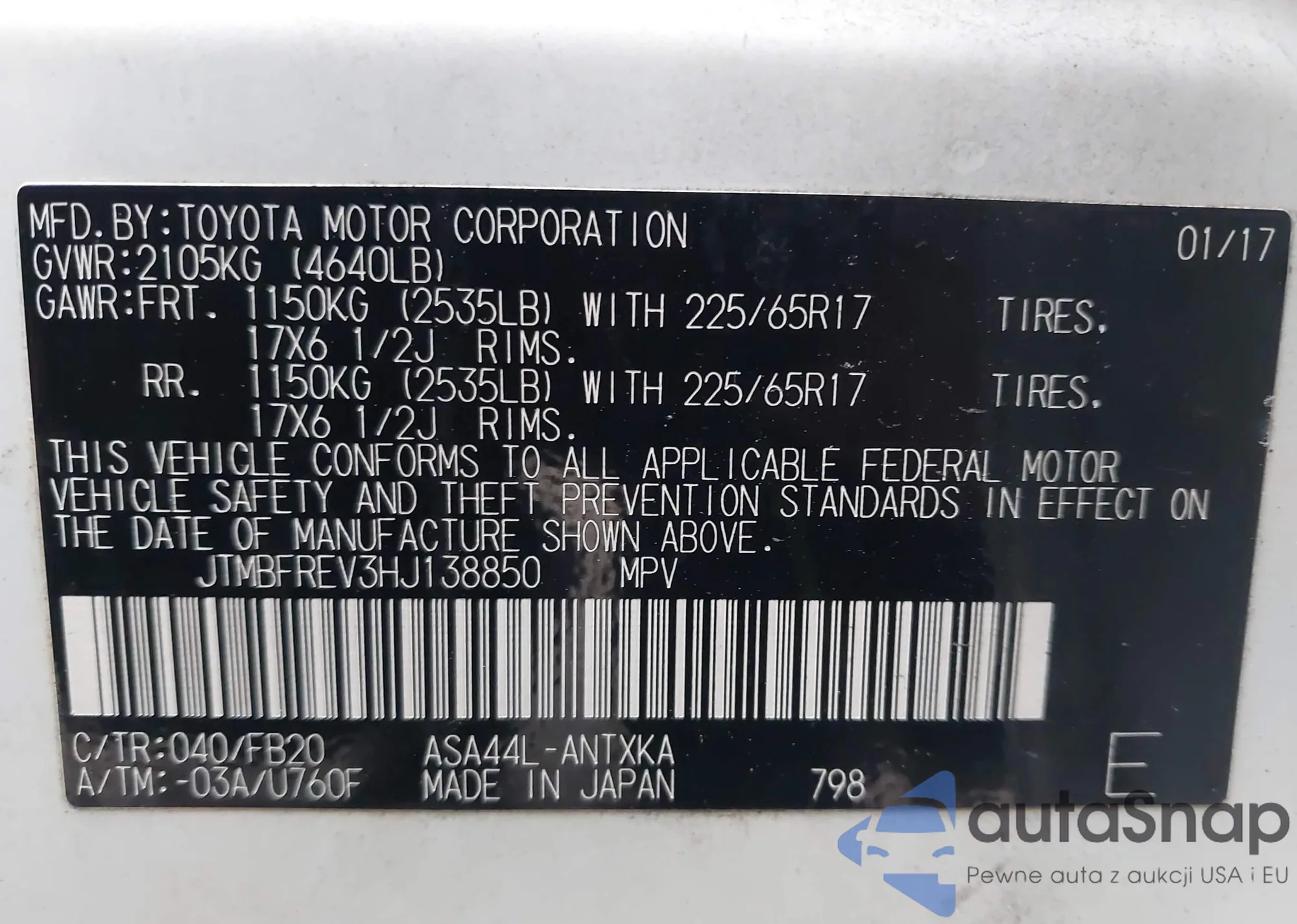 • VIN JTMBFREV3HJ138850
