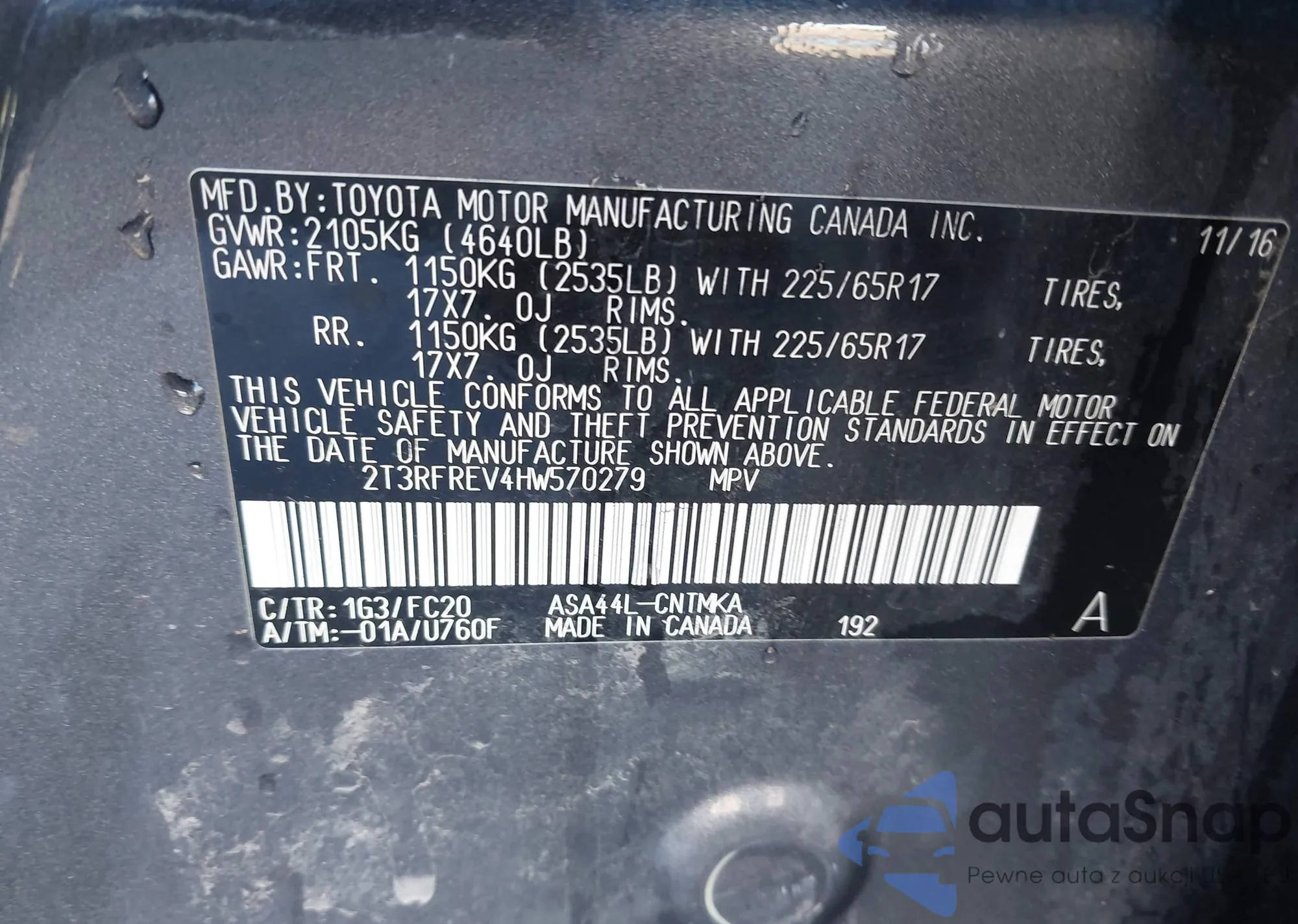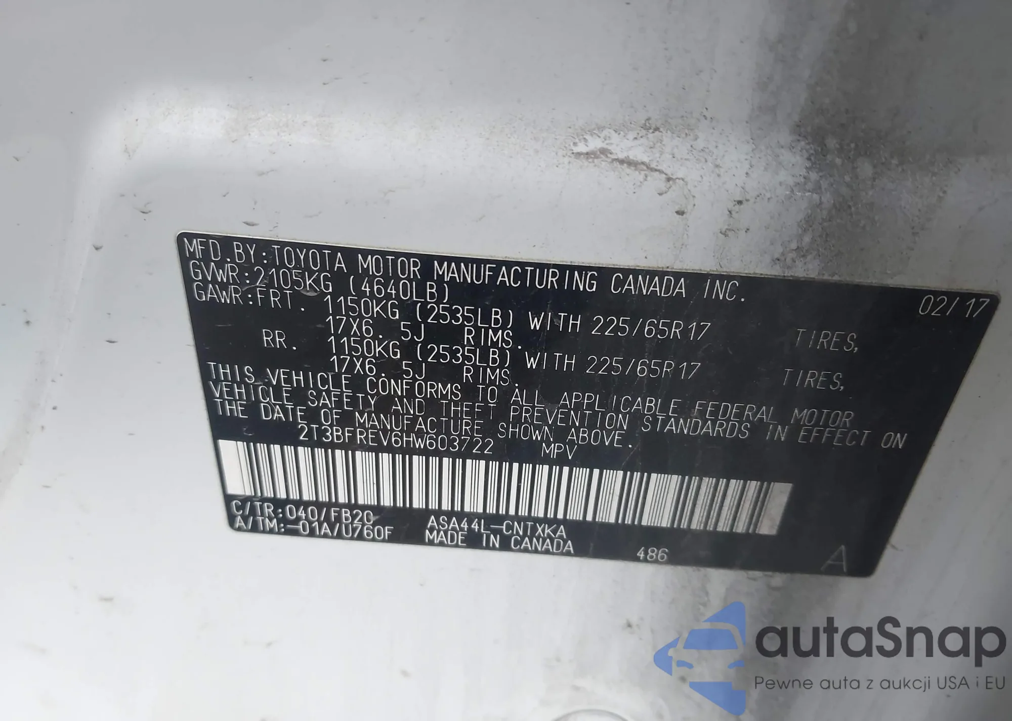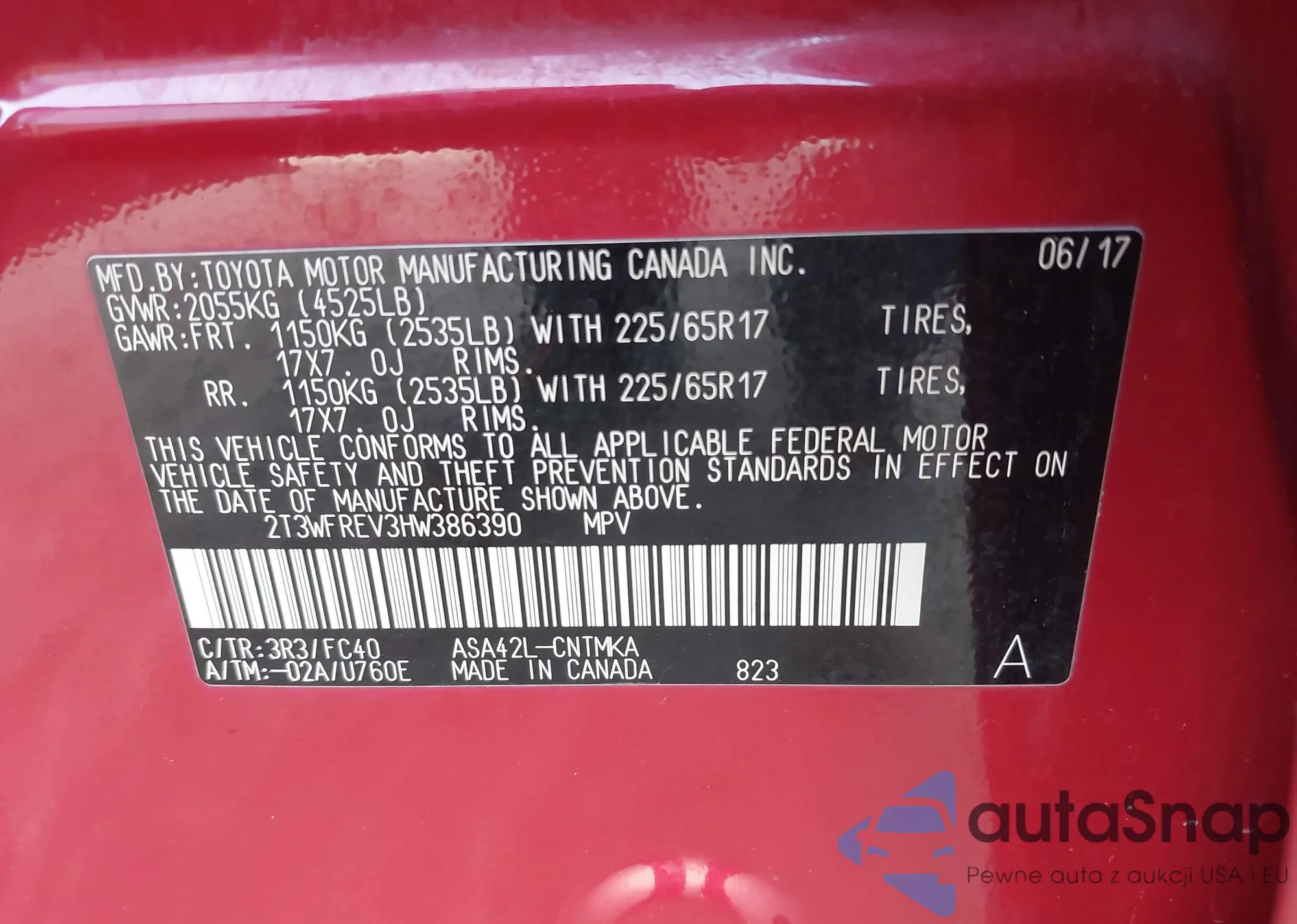 • VIN 2T3ZFREV6HW365045