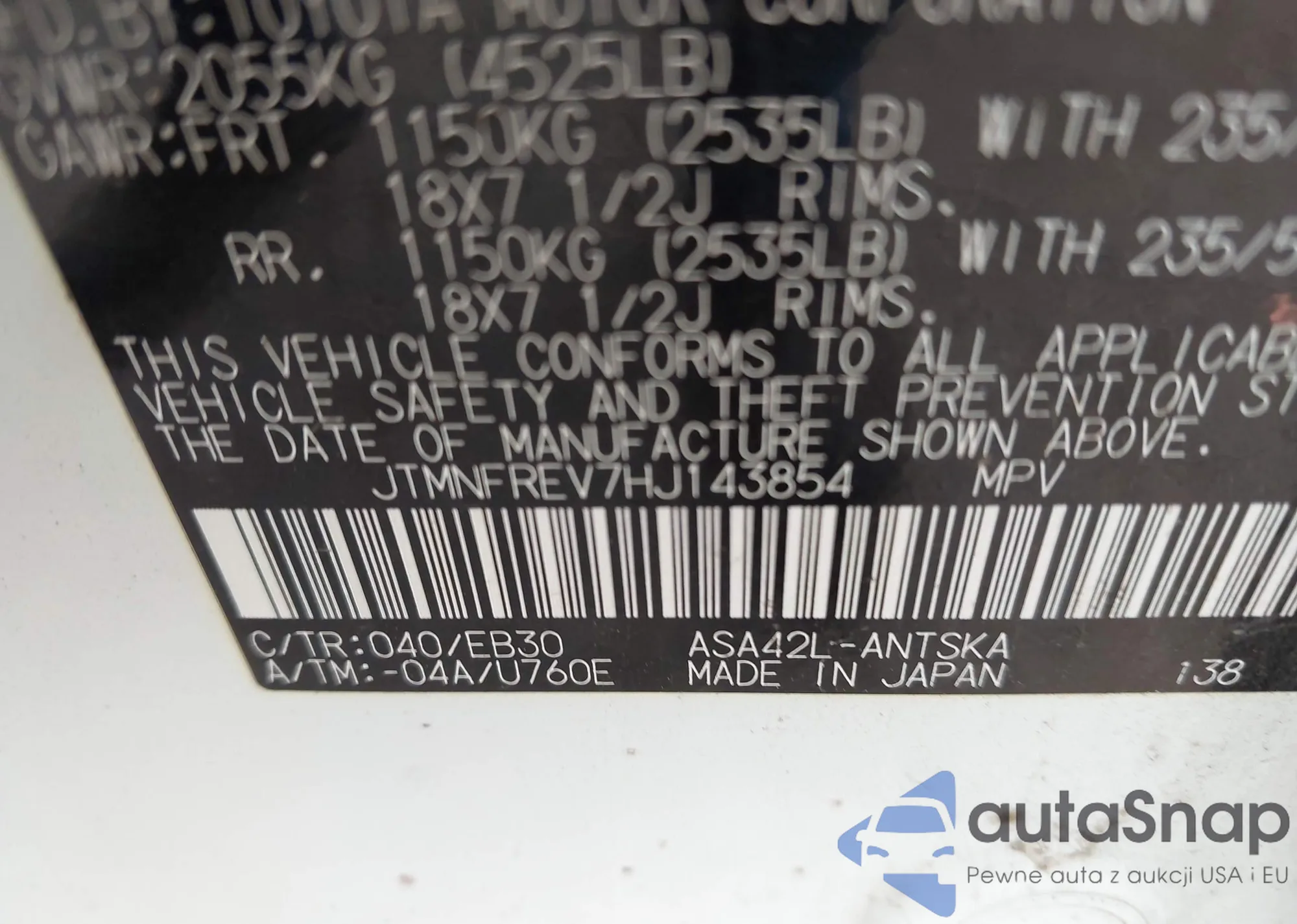 LOT: 44421252 VIN: JTMNFREV7HJ143854