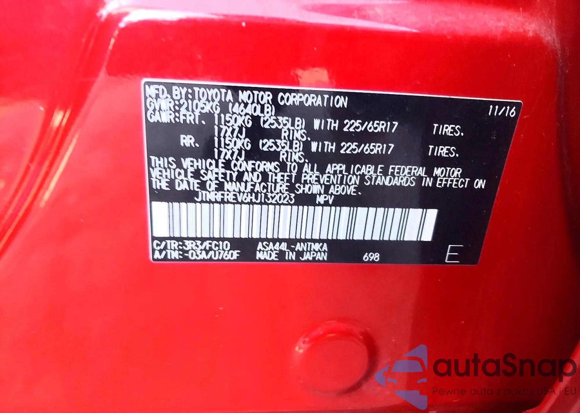 LOT: 45483516 VIN: JTMRFREV6HJ132023
