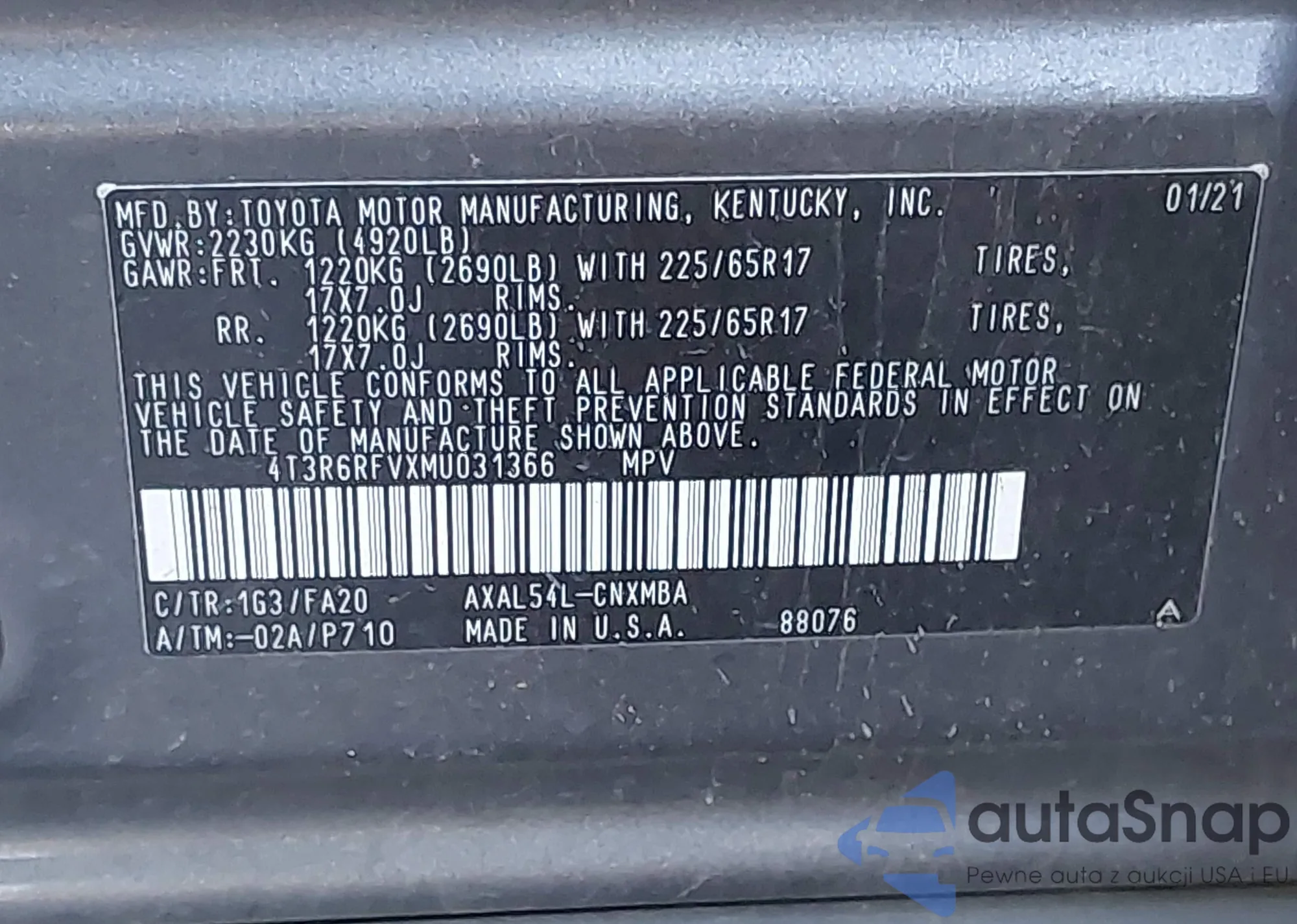 • VIN 4T3R6RFVXMU031366