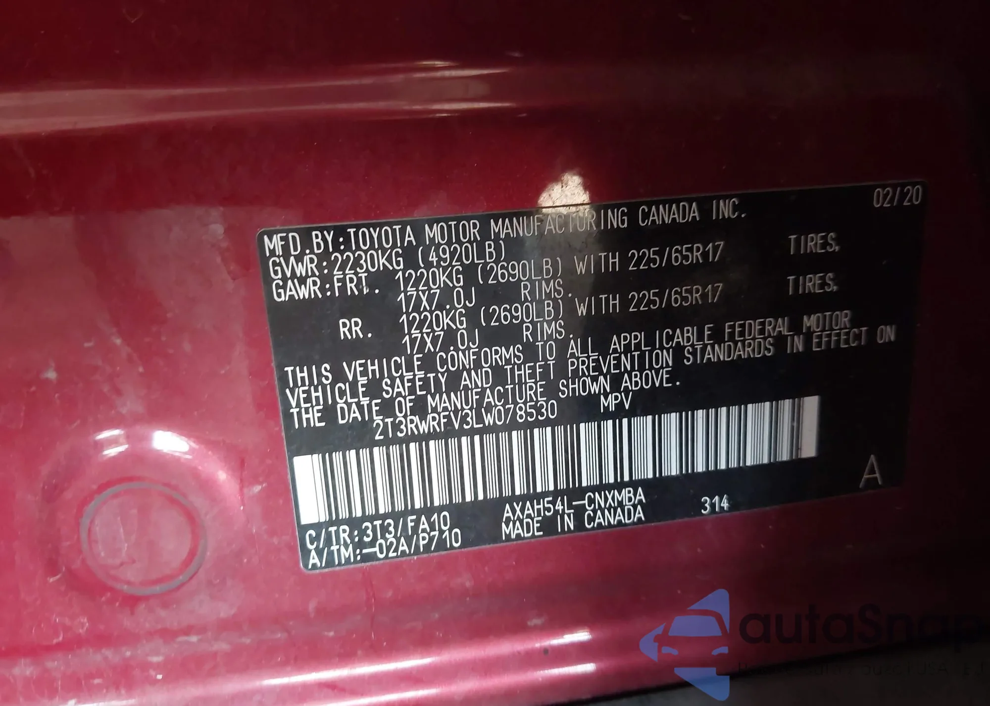 LOT: 44310778 VIN: 2T3RWRFV3LW078530