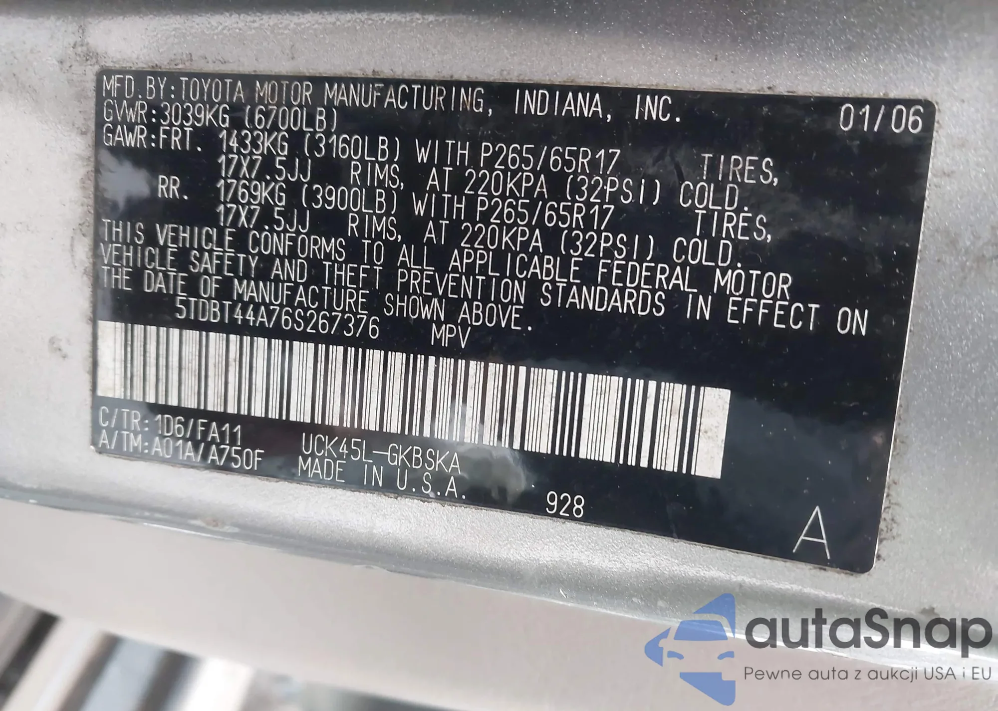 LOT: 44678767 VIN: 5TDBT44A76S267376