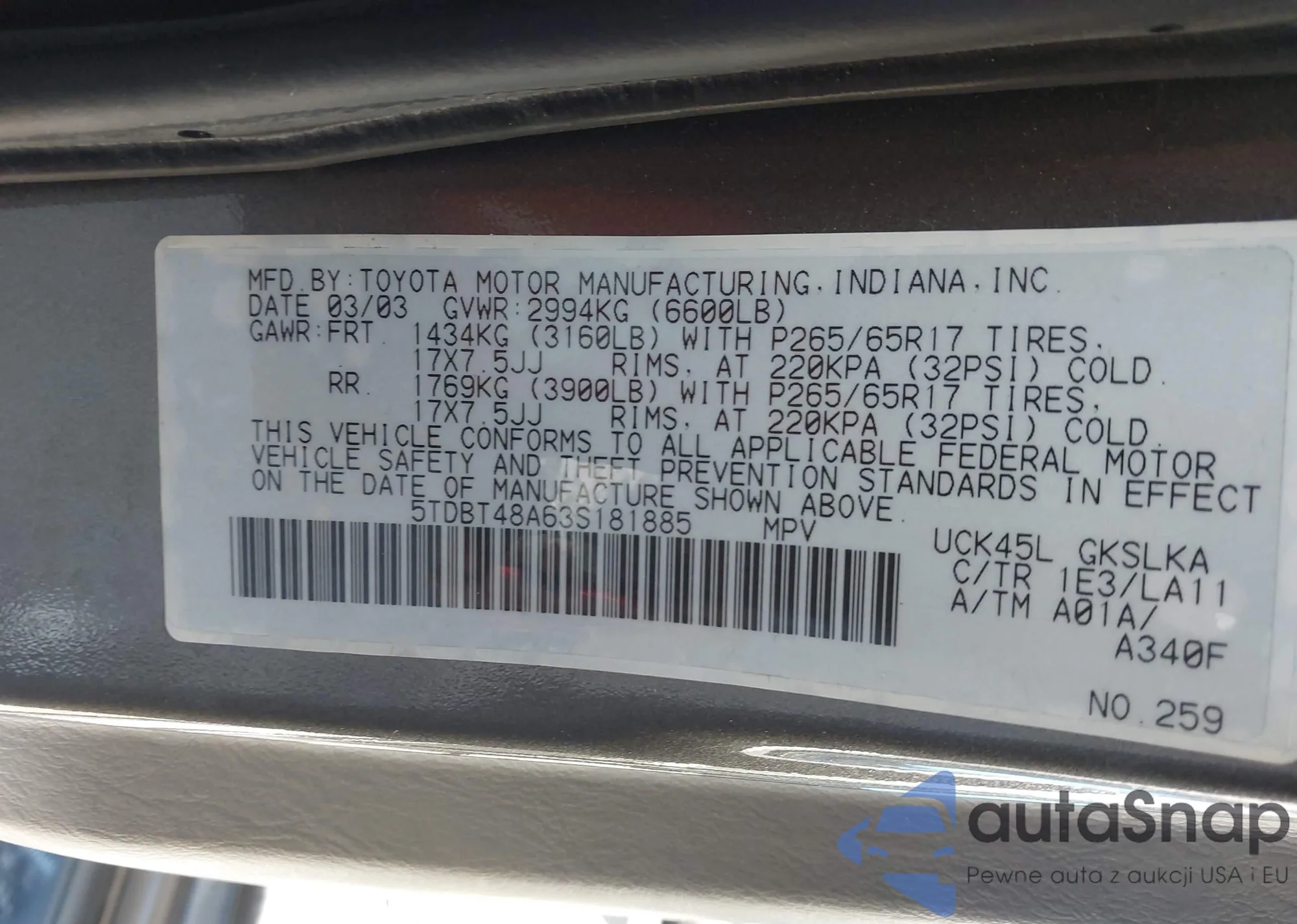 LOT: 44709368 VIN: 5TDBT48A63S181885