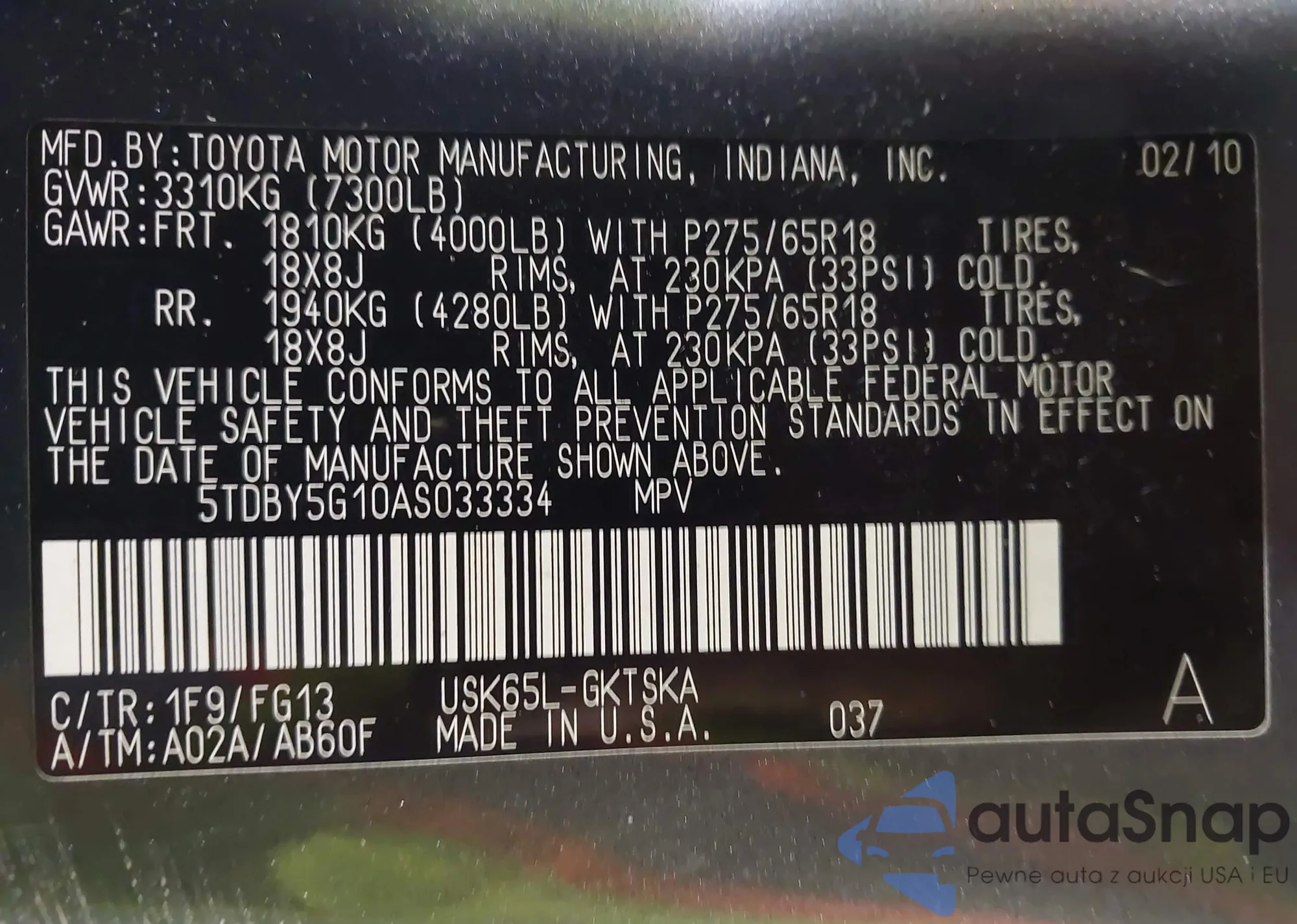 • VIN 5TDBY5G10AS033334