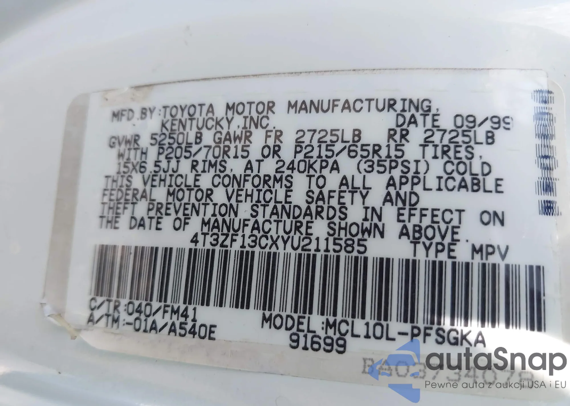 LOT: 43331316 VIN: 4T3ZF13C6YU205637