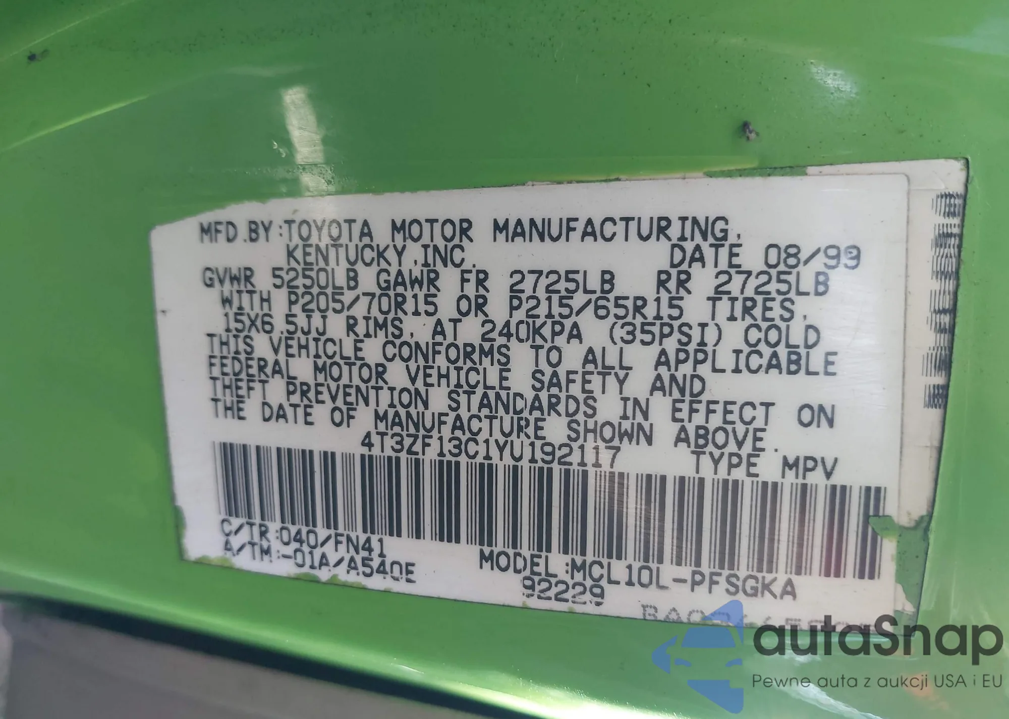 • VIN 4T3ZF13C1YU192117