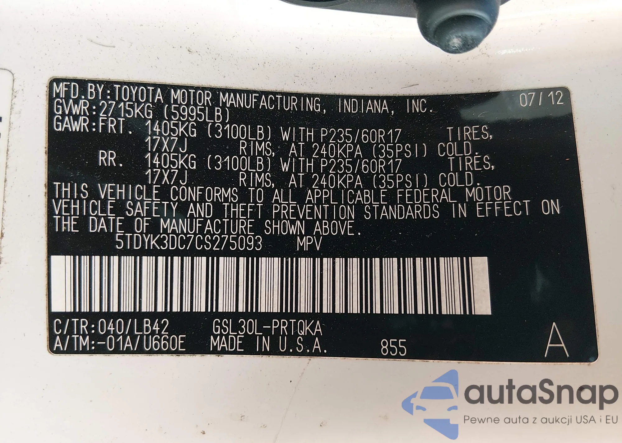 • VIN 5TDYK3DC7CS275093