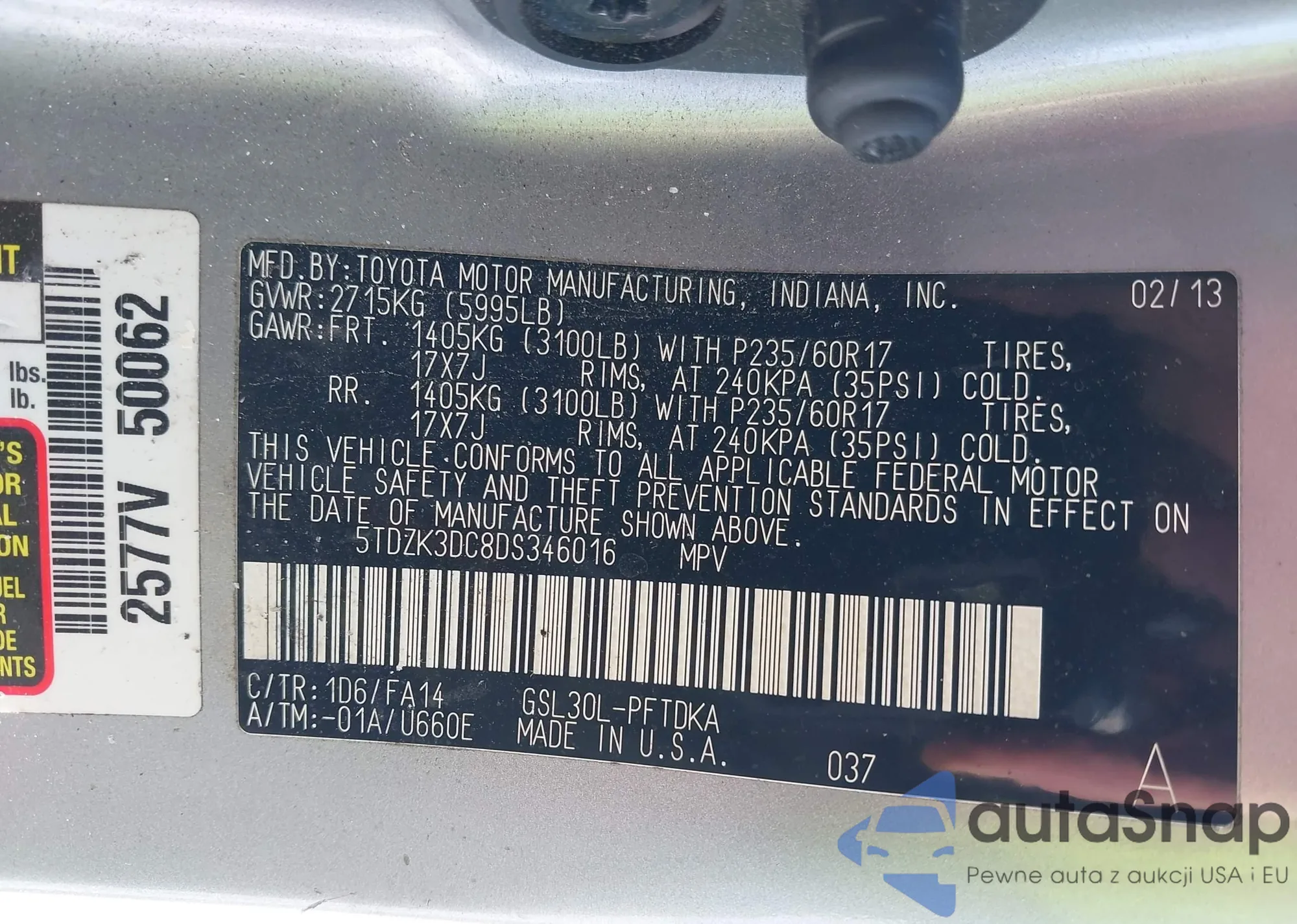LOT: 44237217 VIN: 5TDZK3DC8DS346016