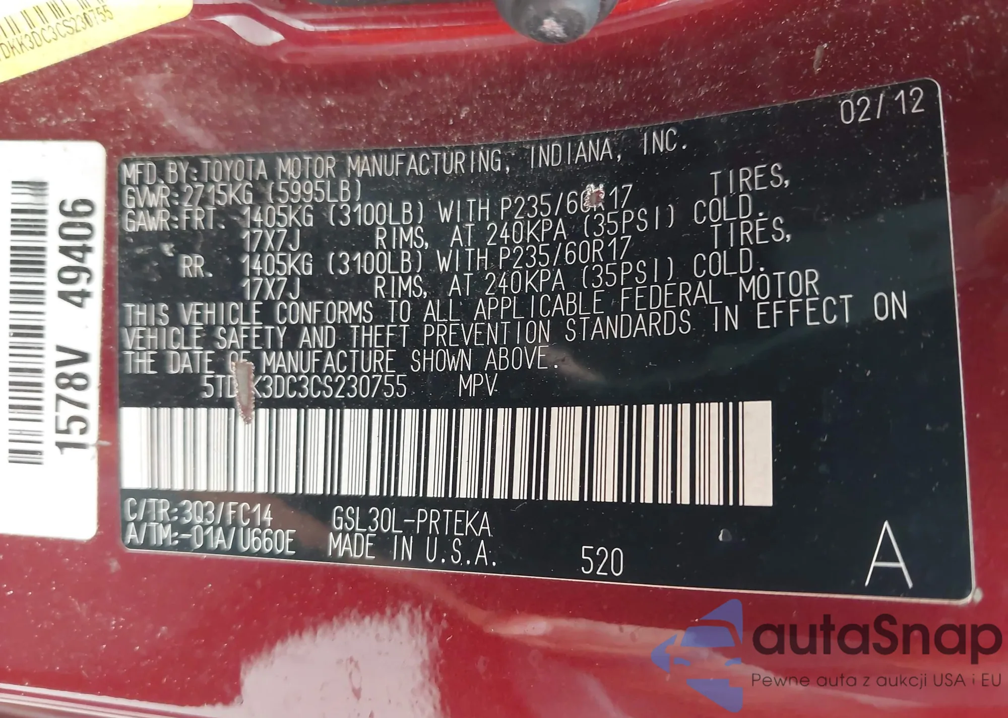 LOT: 43286372 VIN: 5TDKK3DC3CS230755