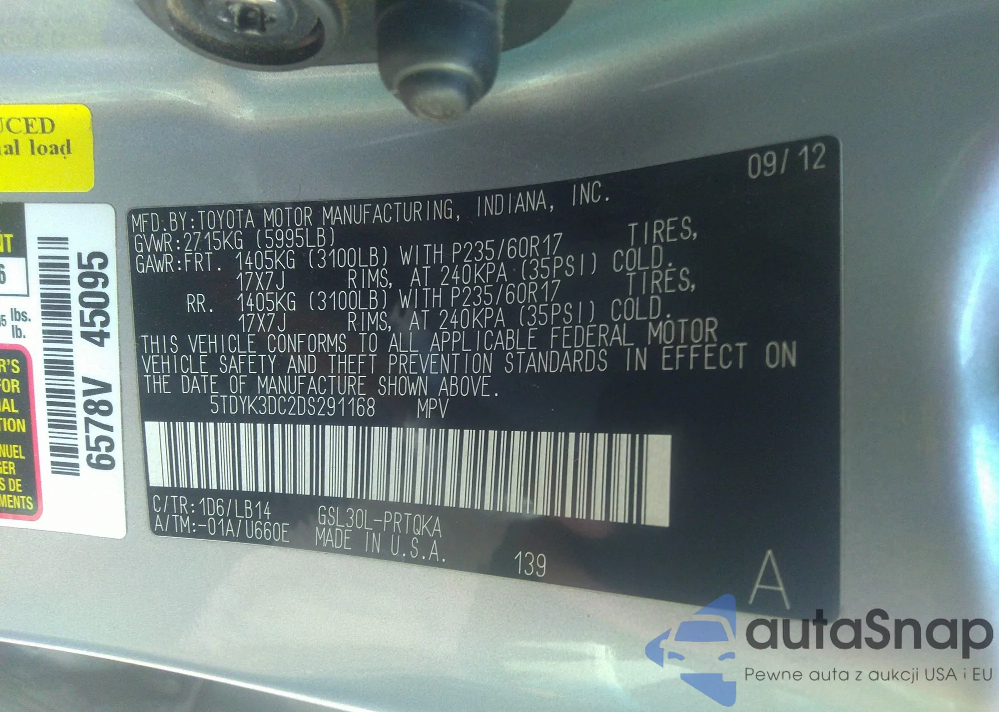 LOT: 32433371 VIN: 5TDYK3DC2DS291168