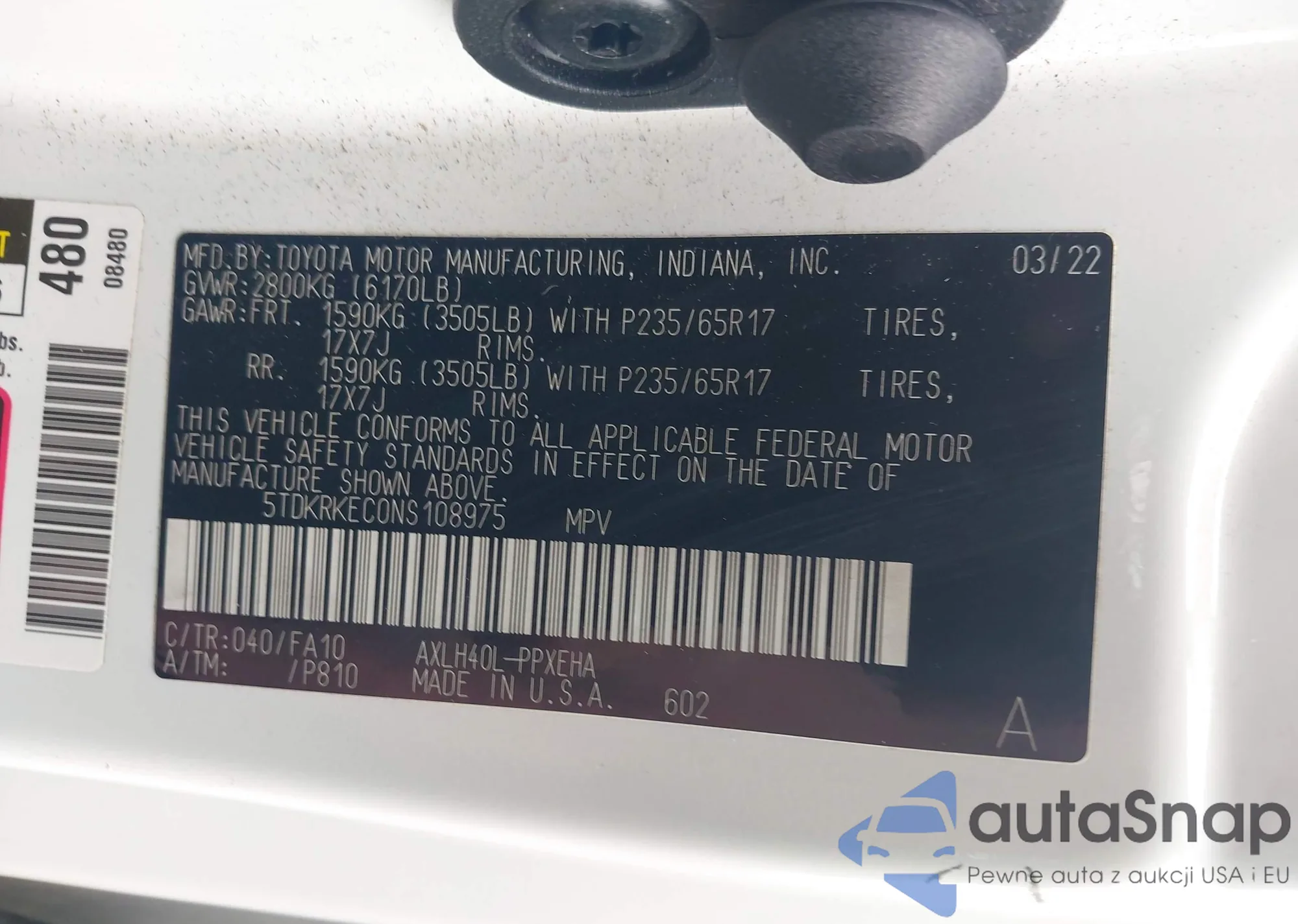 LOT: 44546424 VIN: 5TDKRKEC0NS108975