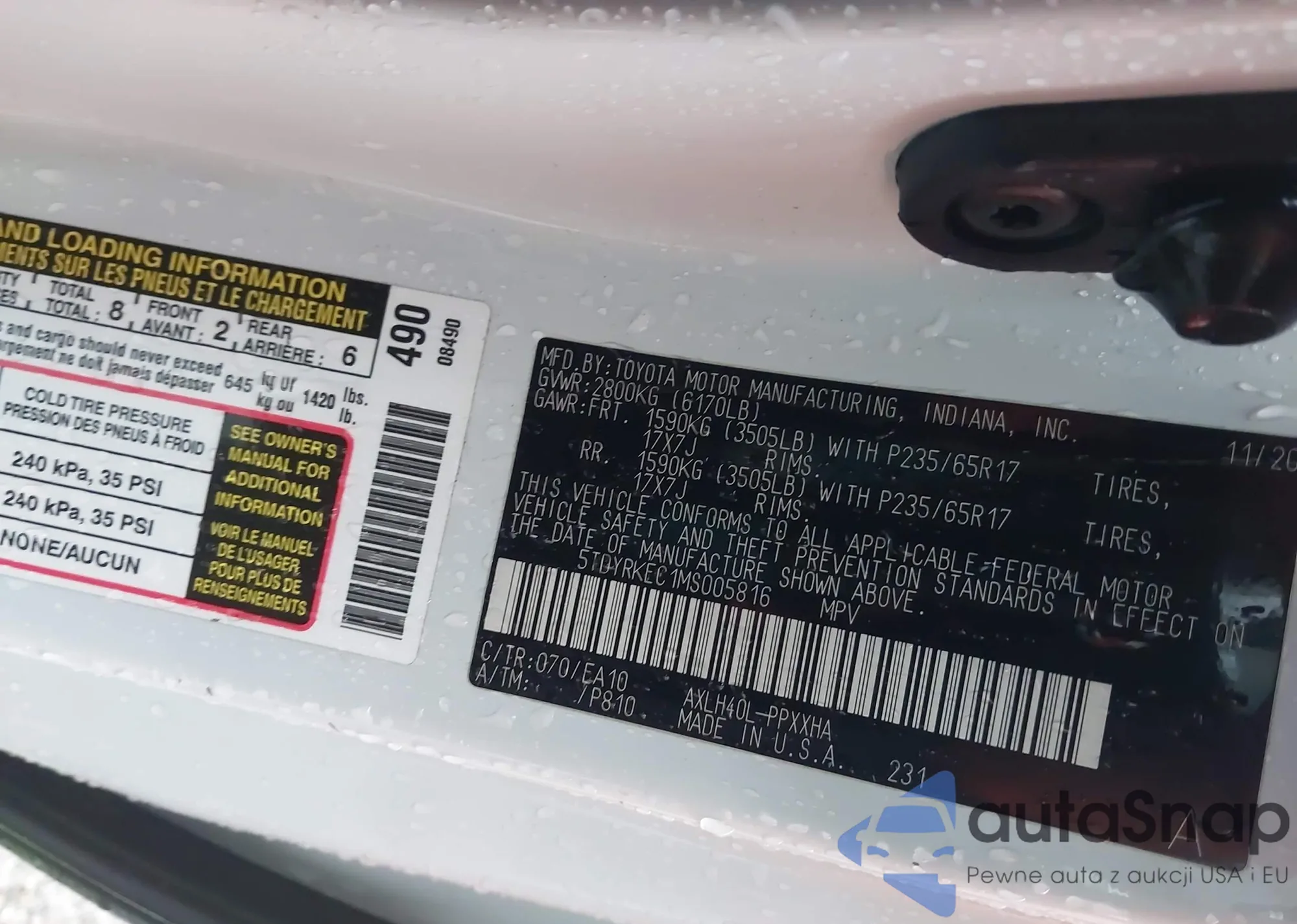 LOT: 43813353 VIN: 5TDXRKEC2MS007229