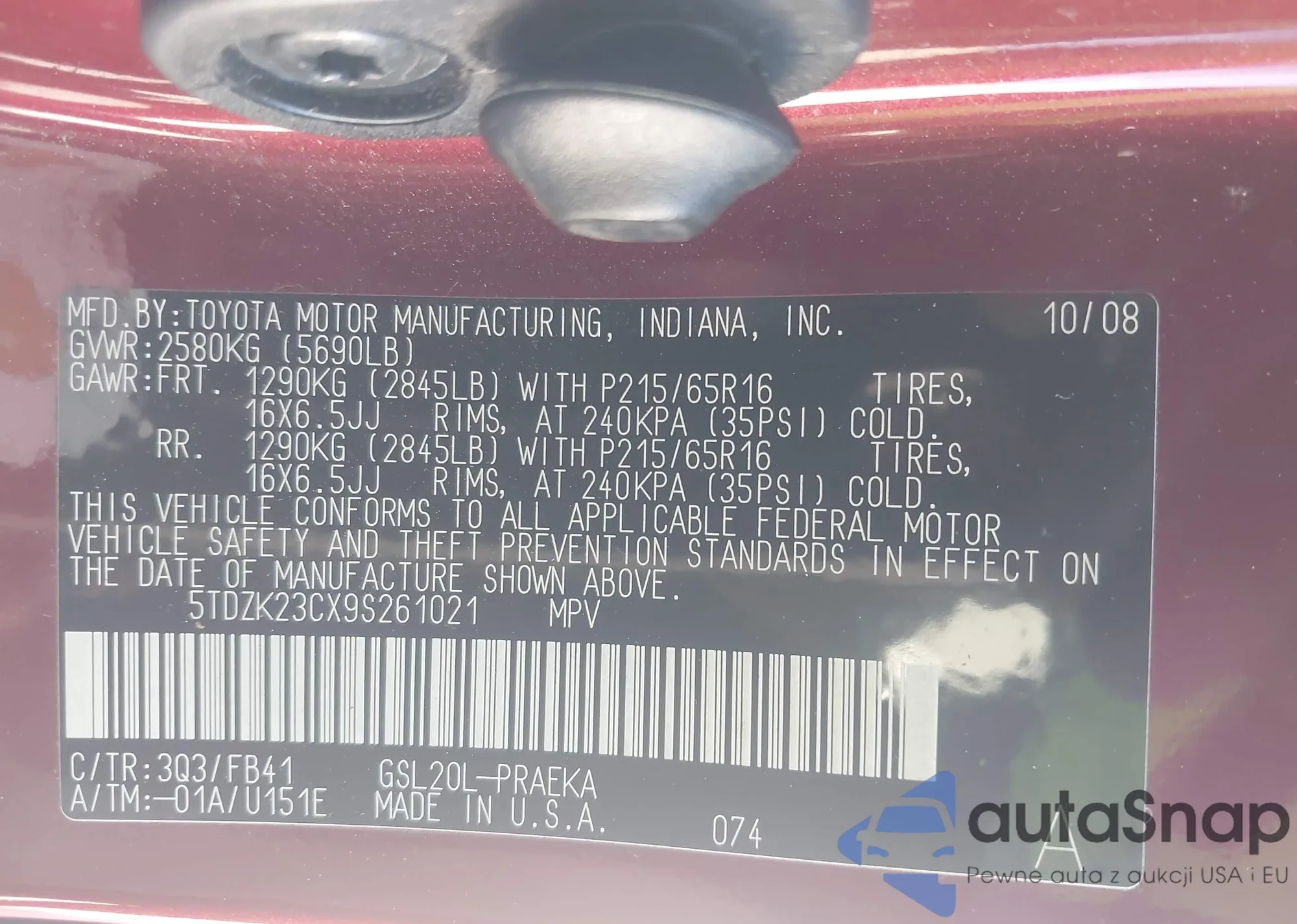 • VIN 5TDZK23CX9S261021