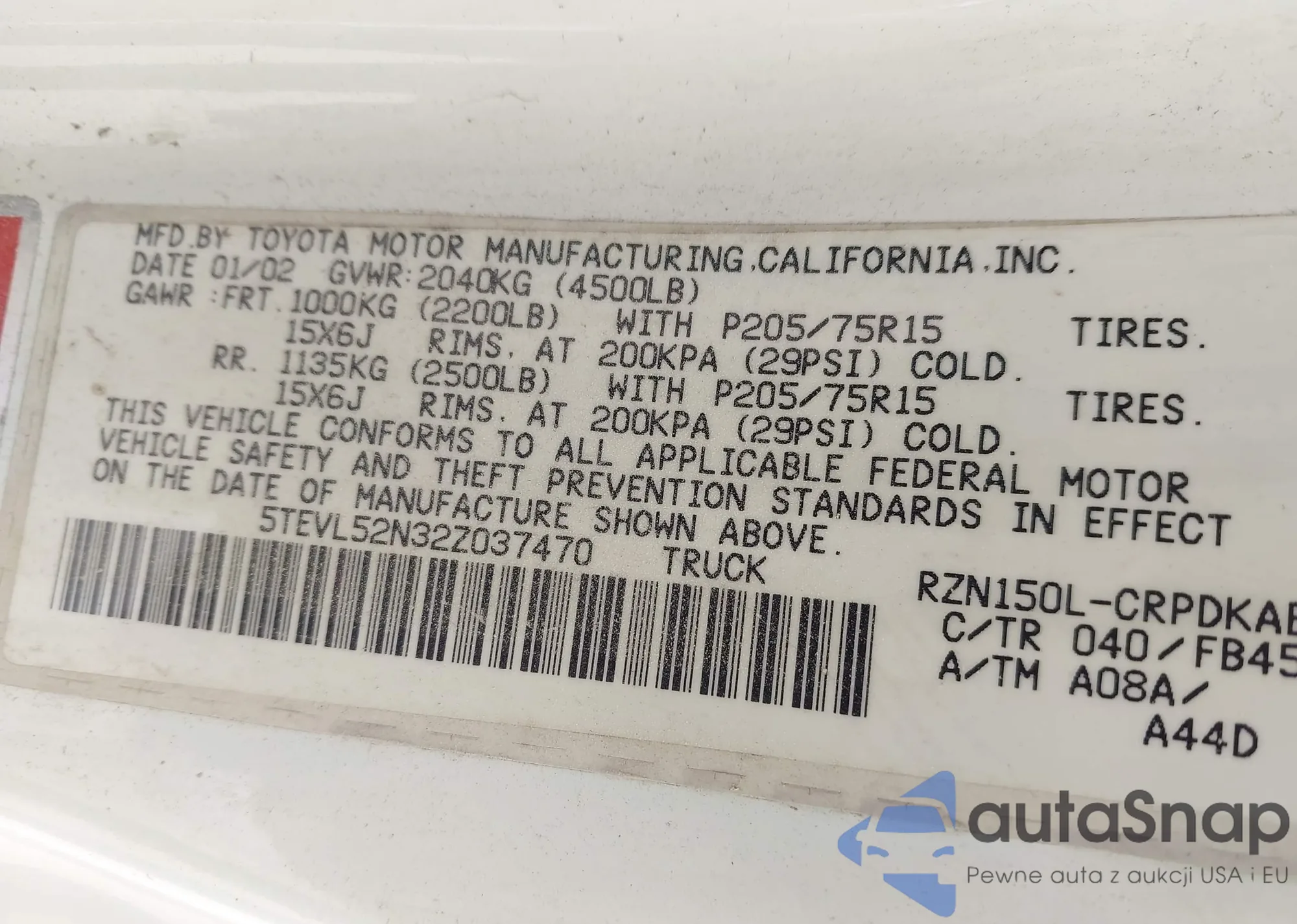 LOT: 44616080 VIN: 5TEVL52N32Z037470