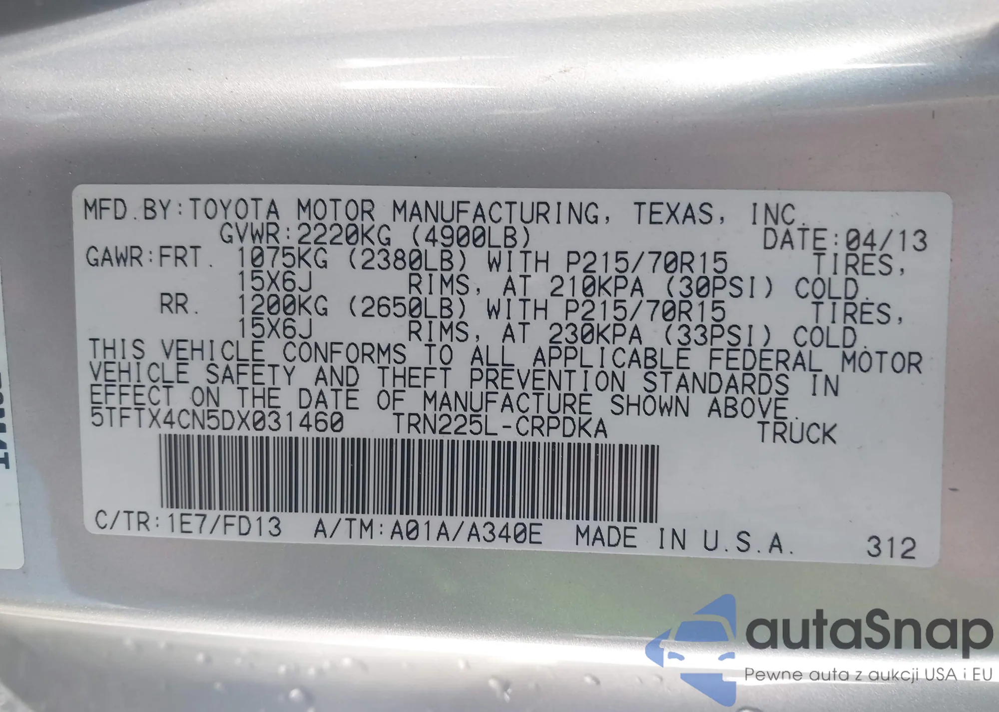• VIN 5TFTX4CN5DX031460