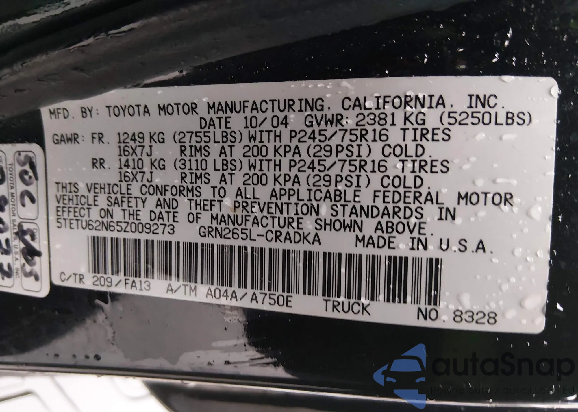 • VIN 5TETU62N65Z009273