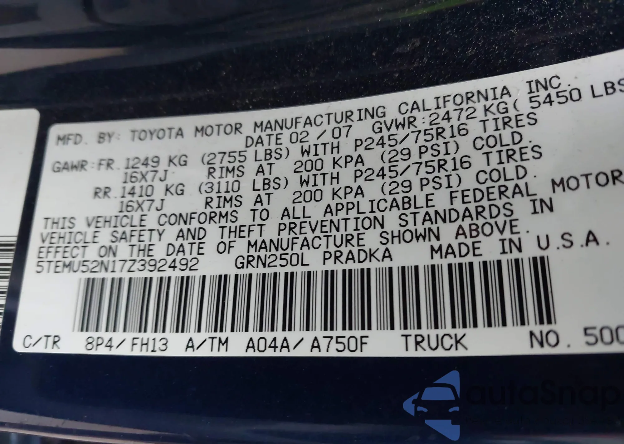 • VIN 5TETU62N87Z336454