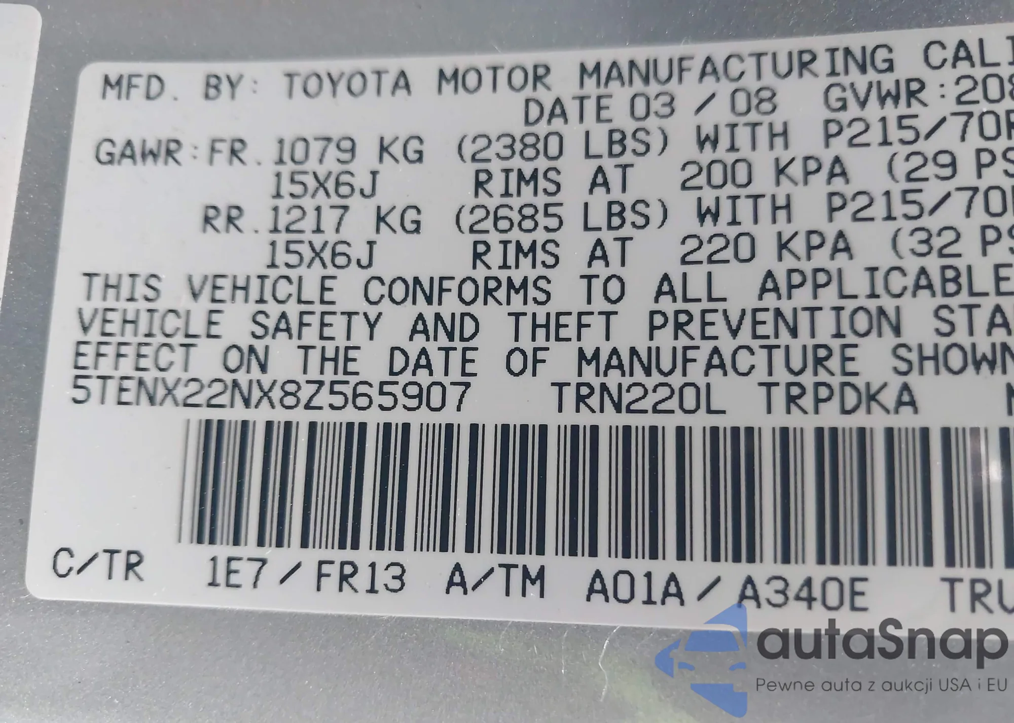 • VIN 5TENX22NX8Z565907