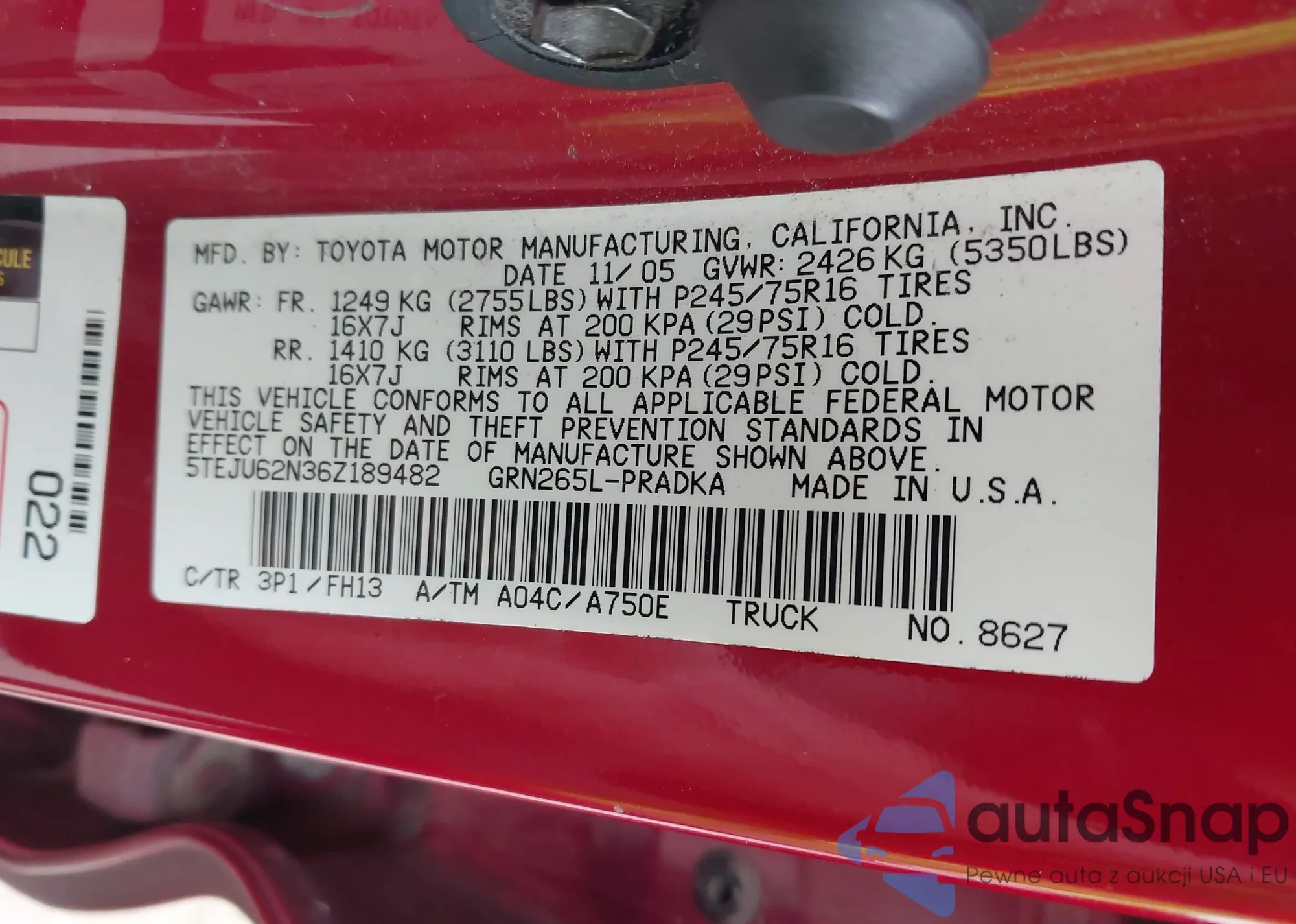 LOT: 44269497 VIN: 5TEJU62N36Z189482