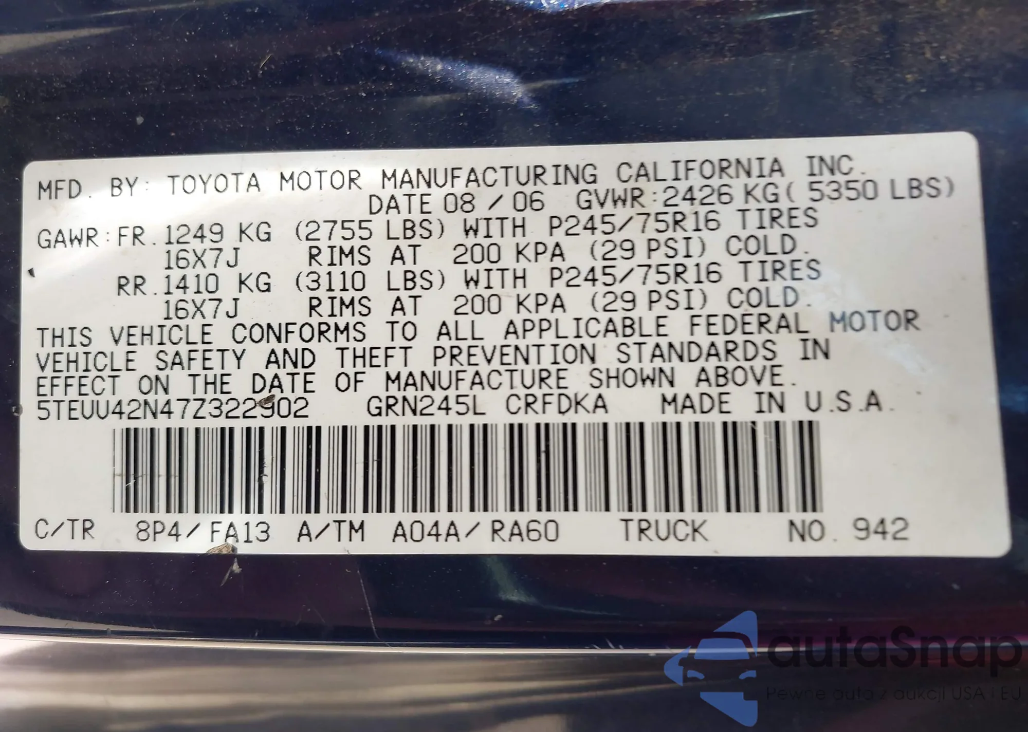 LOT: 43346431 VIN: 5TEUU42N47Z322902