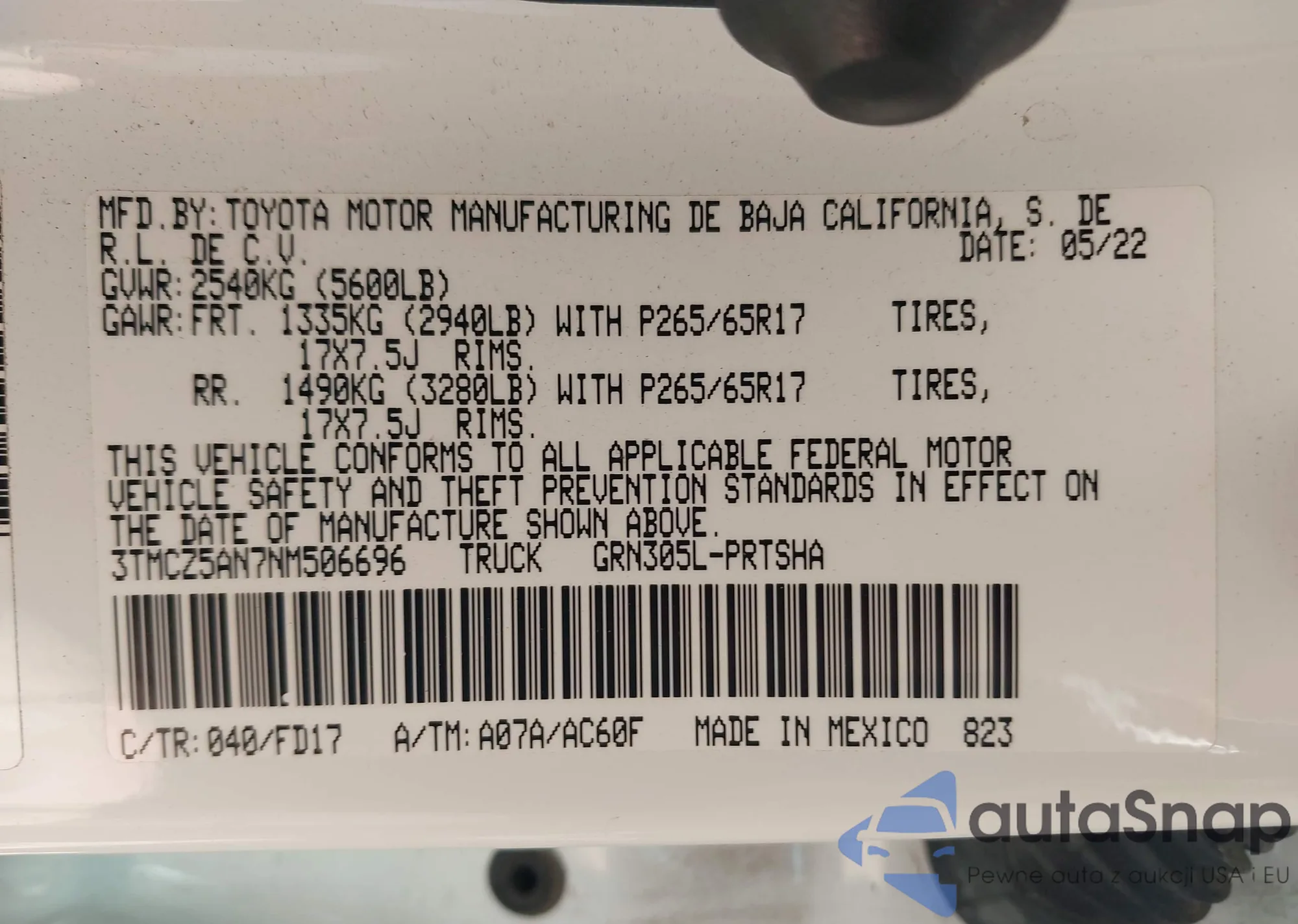 • VIN 3TMCZ5AN7NM506696