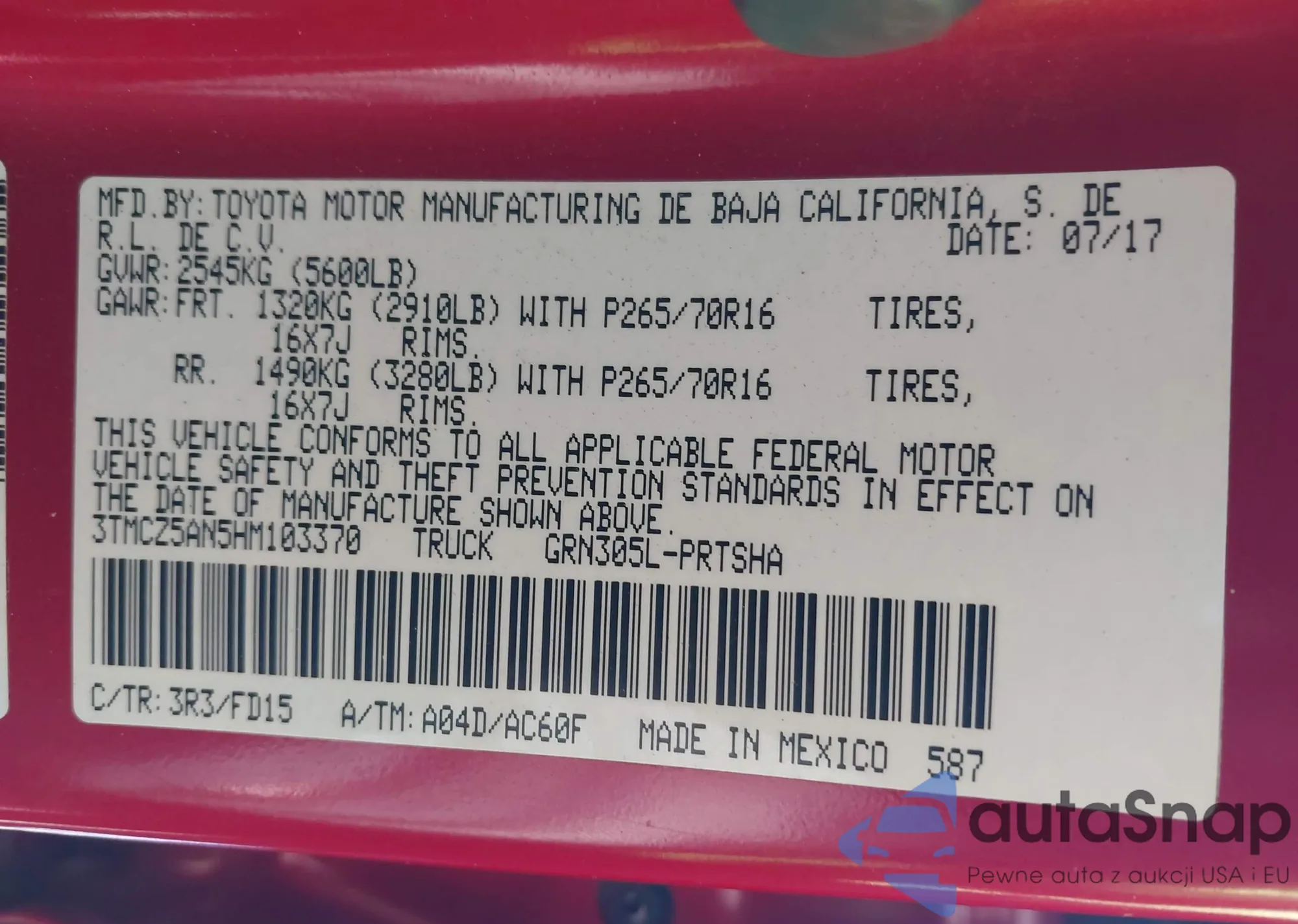 • VIN 3TMCZ5AN5HM103370