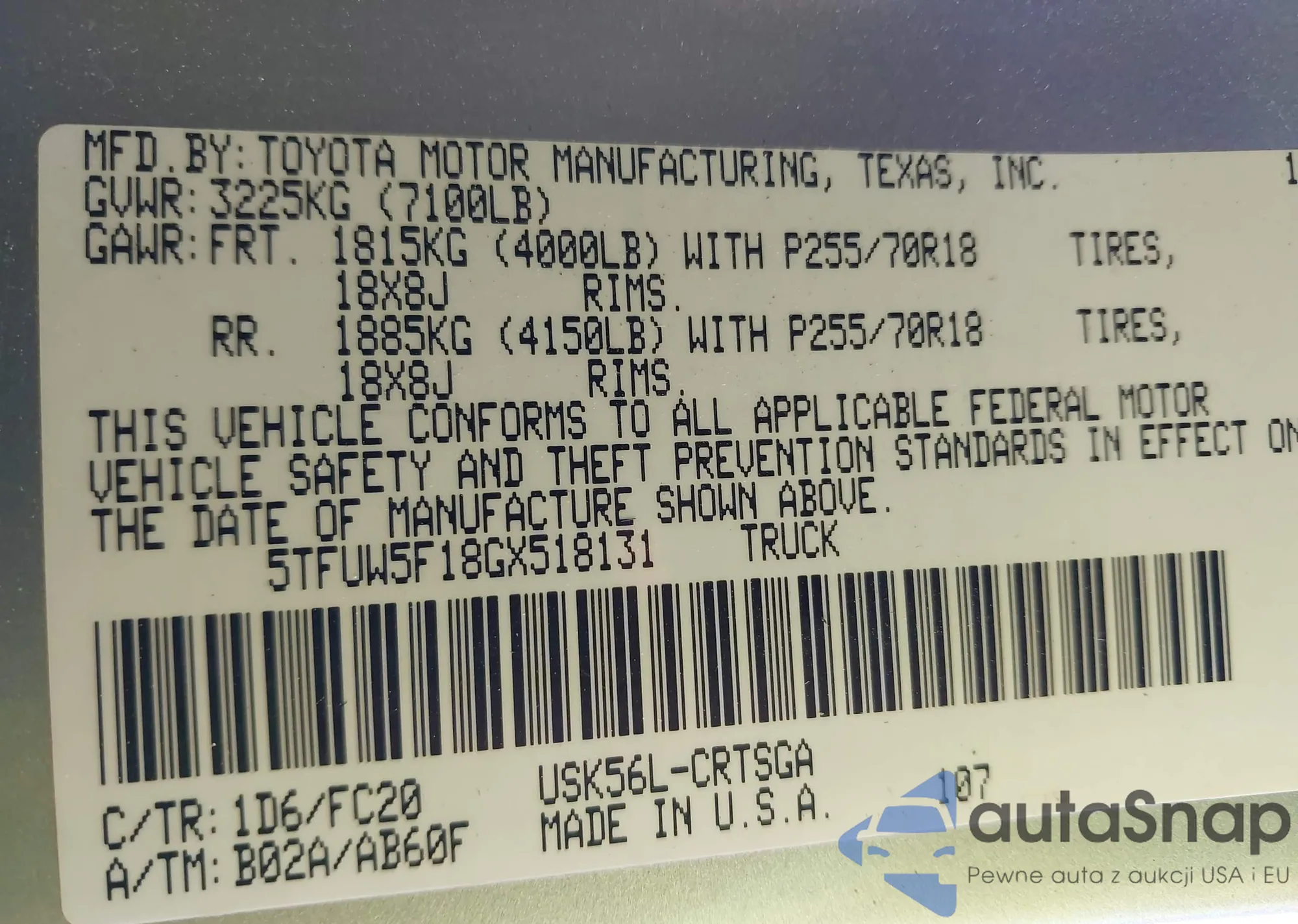 LOT: 38991874 VIN: 5TFUW5F18GX518131