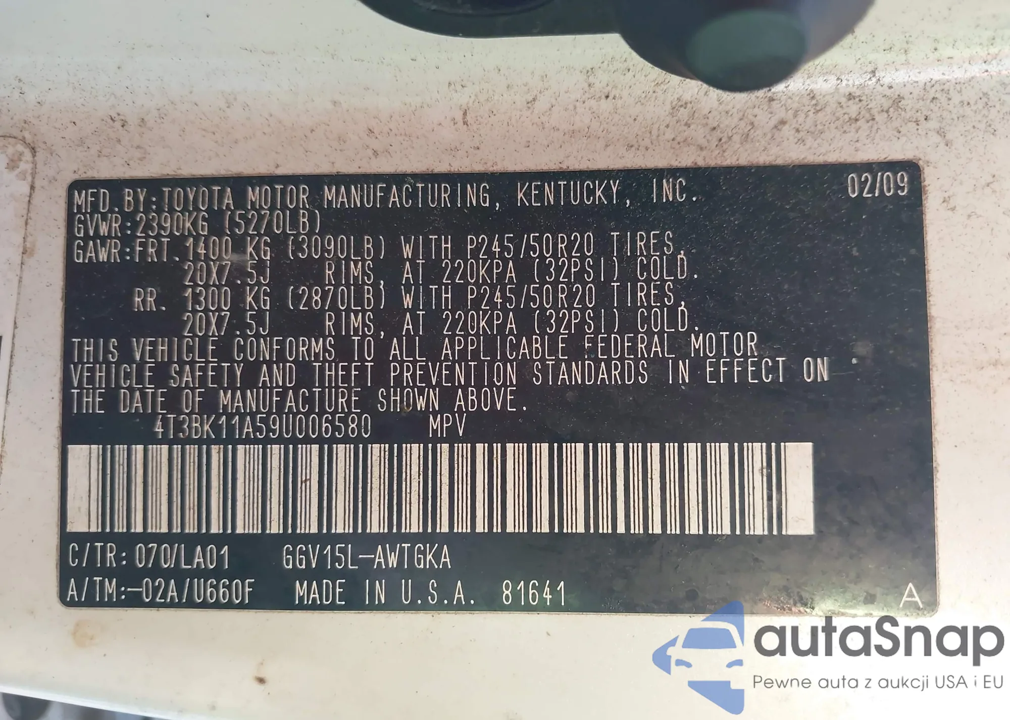 • VIN 4T3BK11A59U006580
