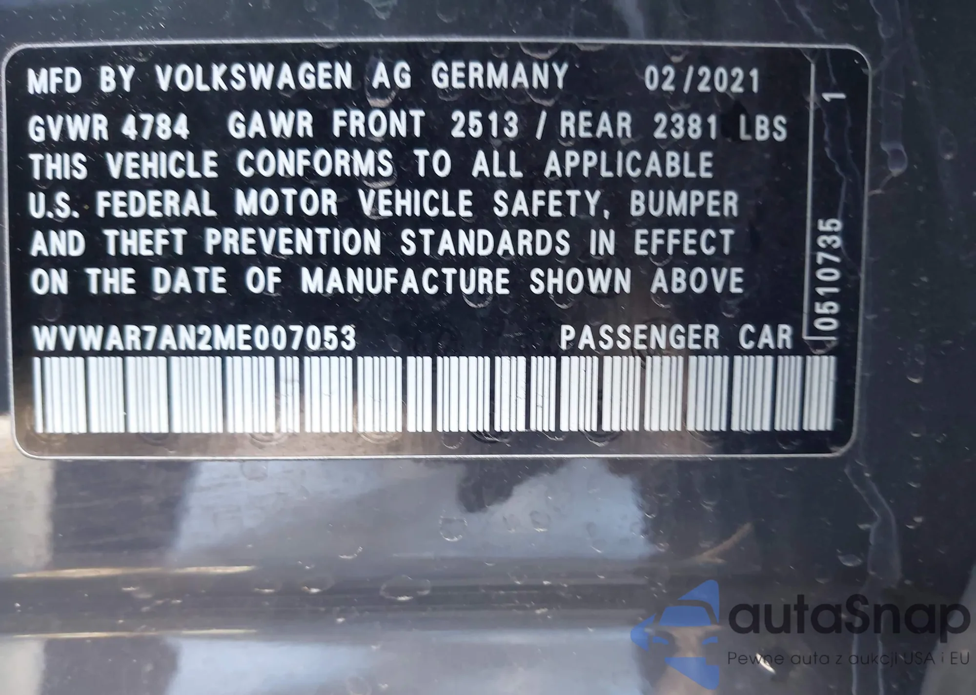 • VIN WVWAR7AN2ME007053