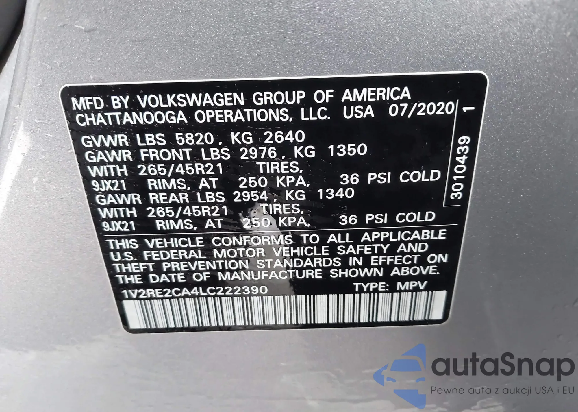 LOT: 43942118 VIN: 1V2RE2CA4LC222390