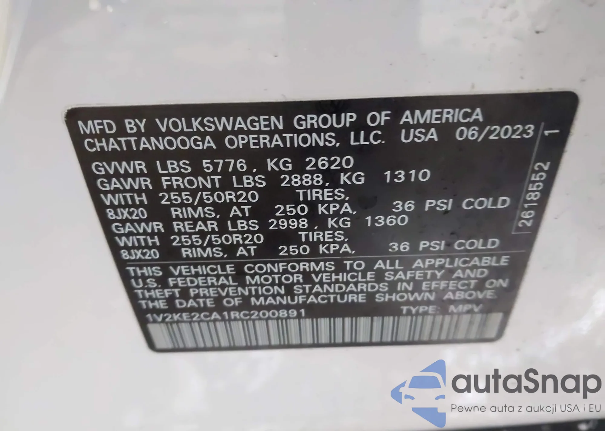 • VIN 1V2KE2CA1RC200891
