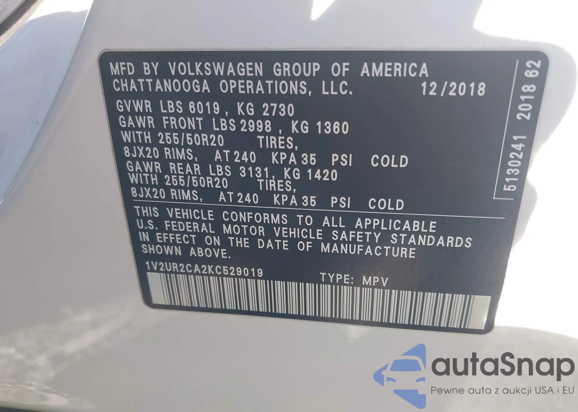 LOT: 44110697 VIN: 1V2UR2CA2KC529019