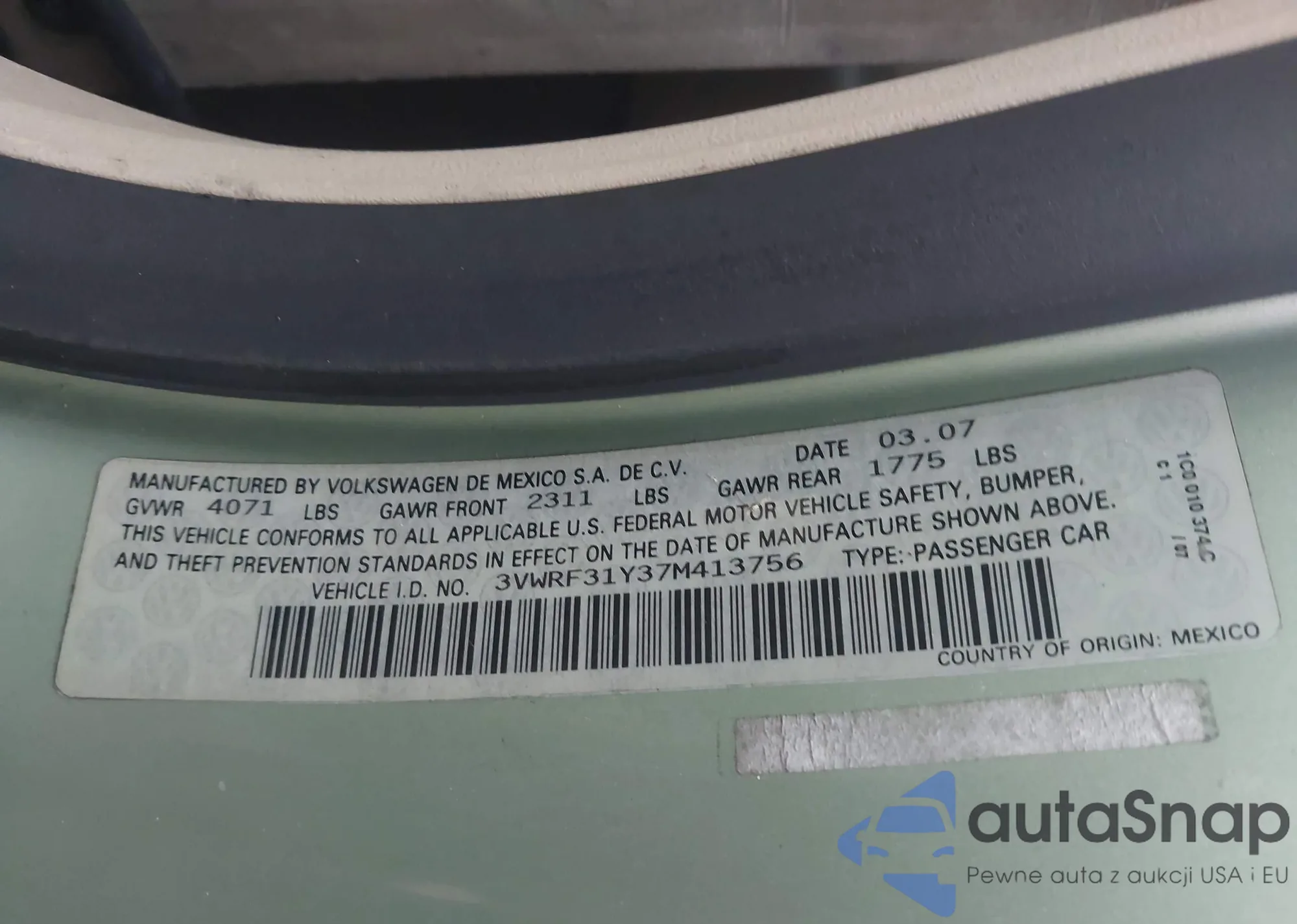 • VIN 3VWRF31Y37M413756