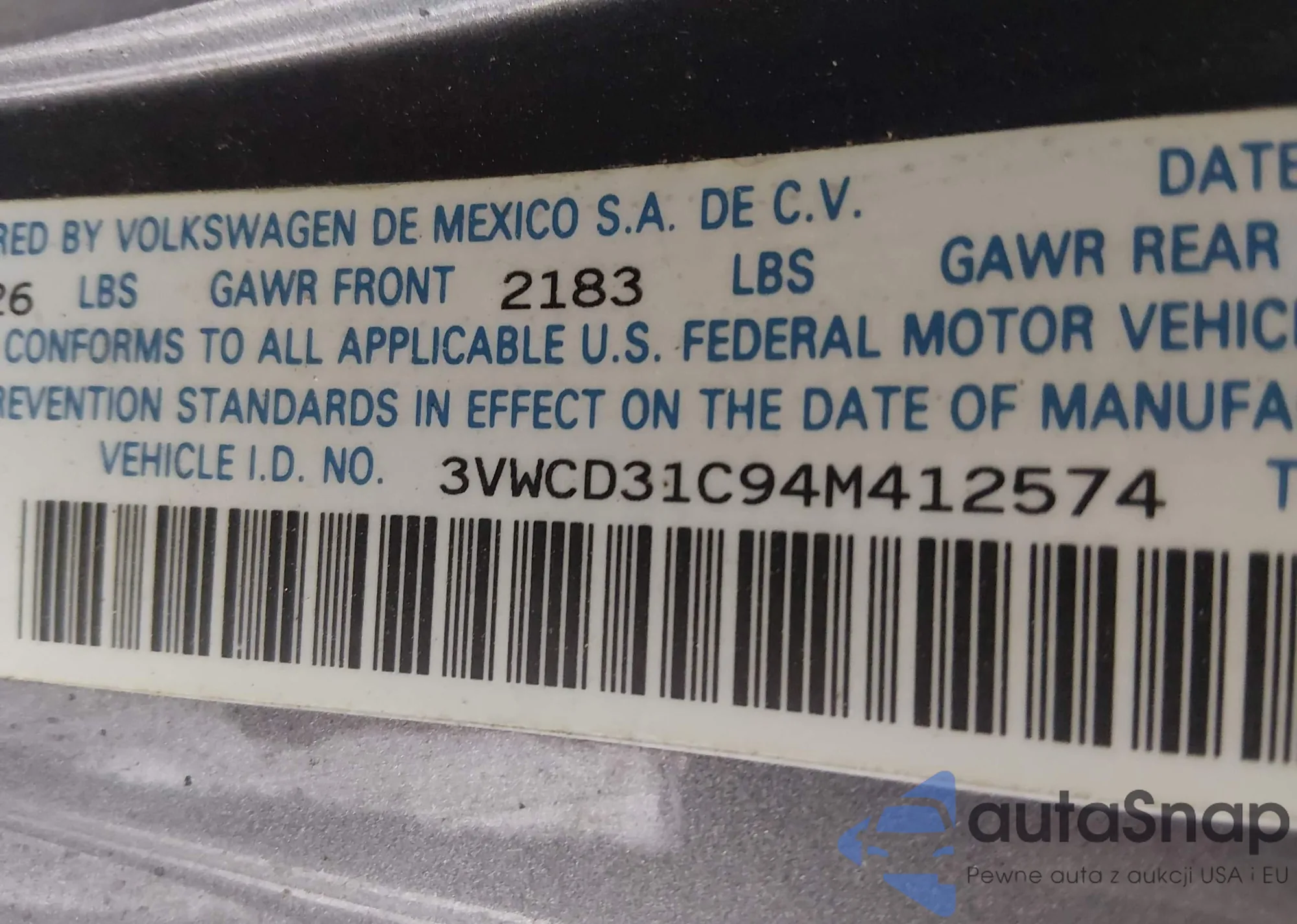 • VIN 3VWCD31C94M412574