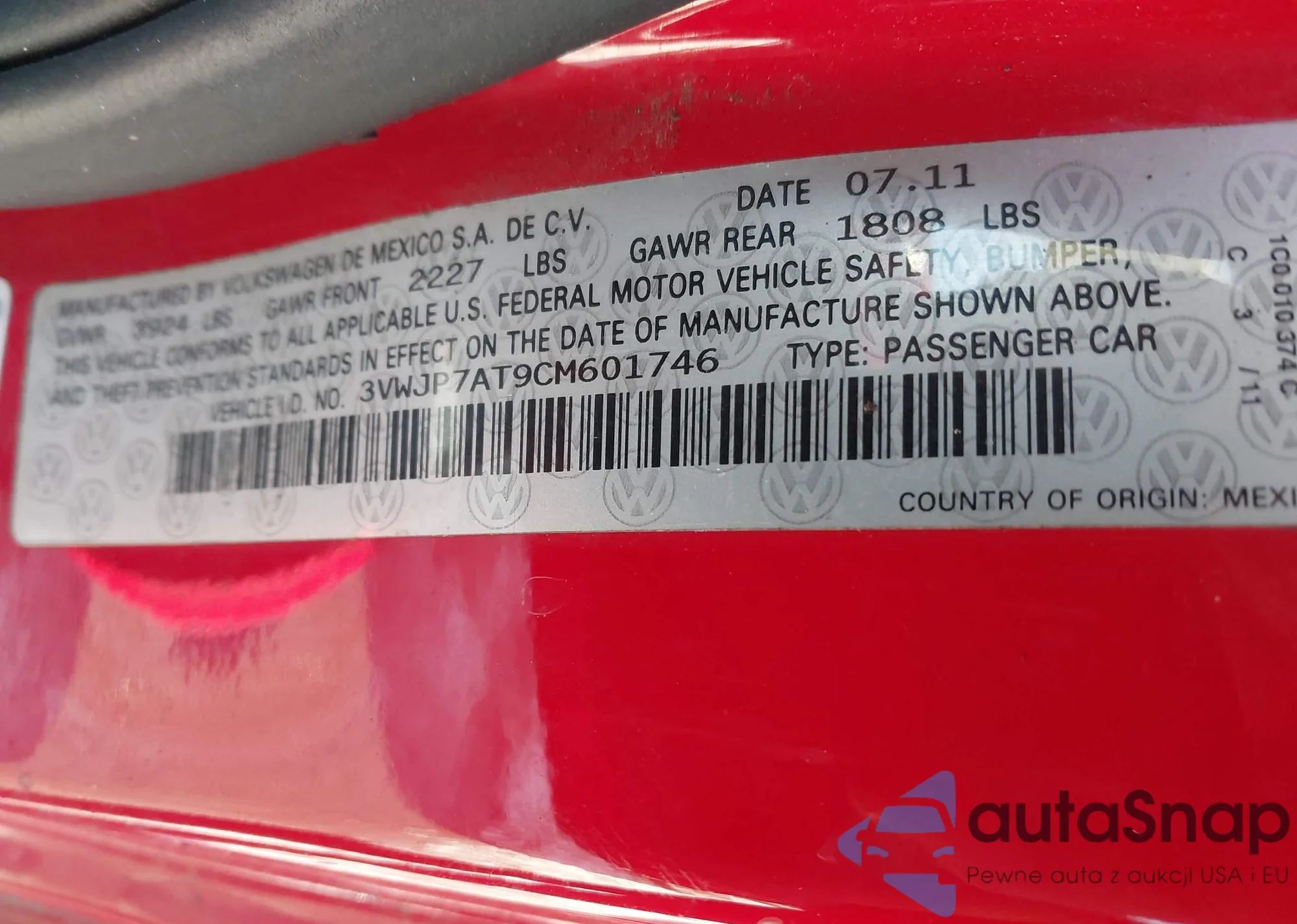 • VIN 3VWJP7AT9CM601746