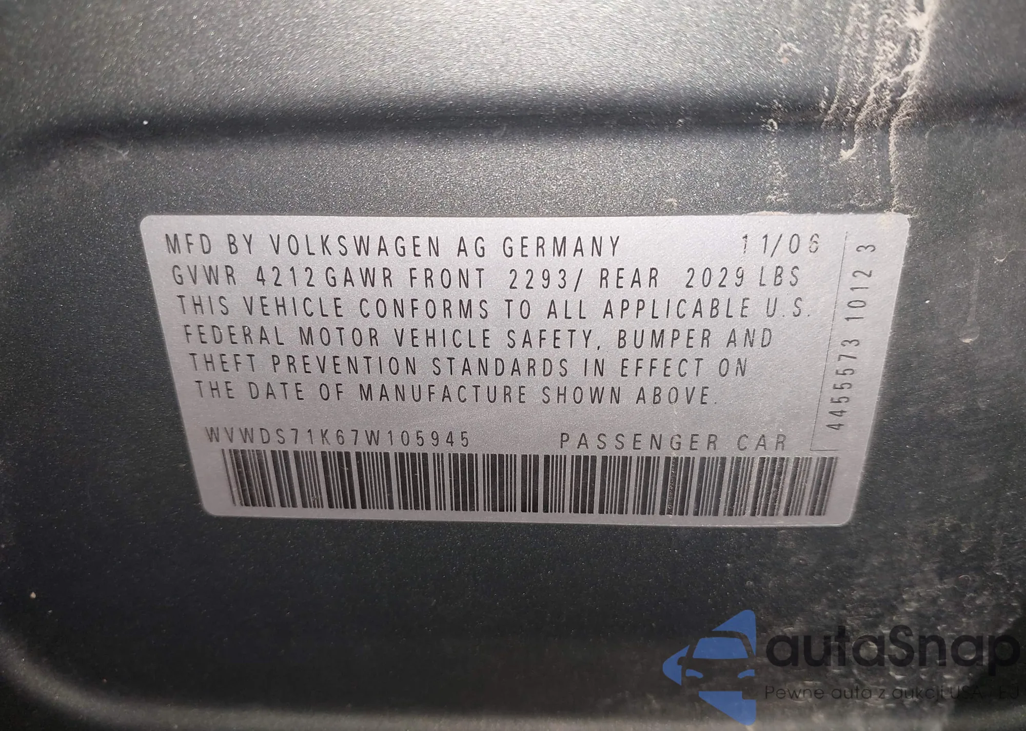• VIN WVWDS71K67W105945