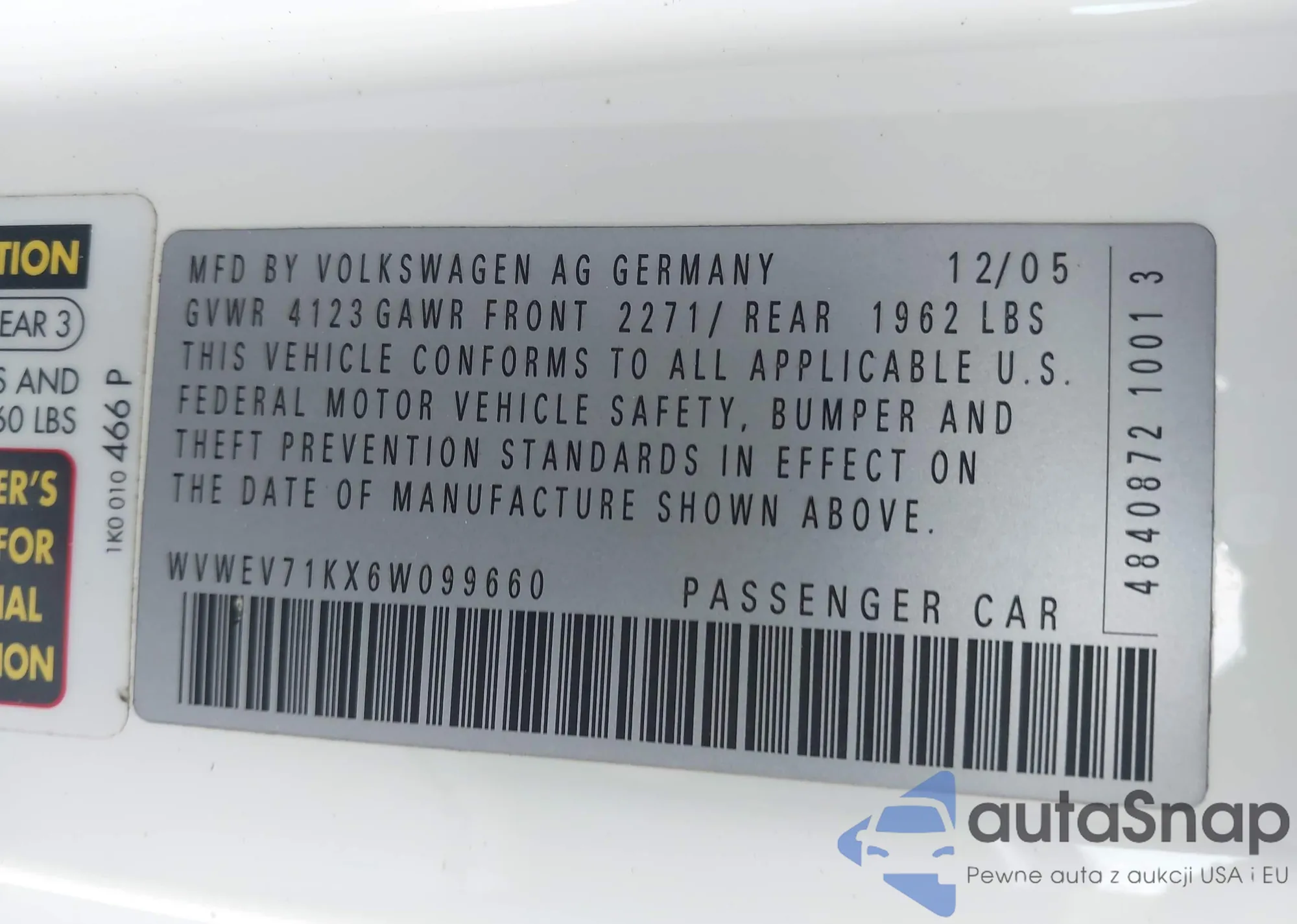 LOT: 44156271 VIN: WVWEV71KX6W099660