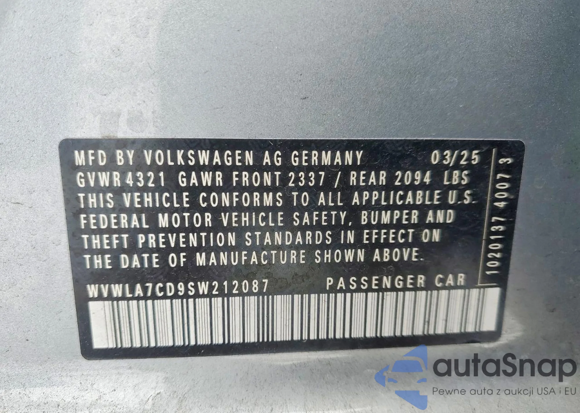 LOT: 94152765 VIN: 3VW6T7AUXMM006139
