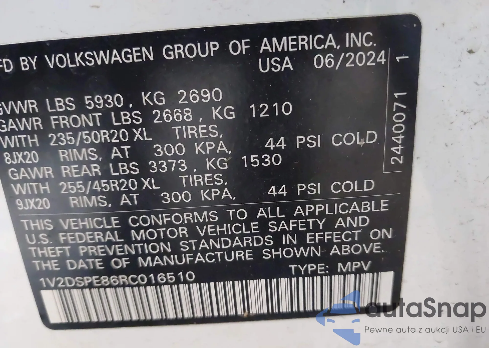 LOT: 44605698 VIN: 1V2VRPE87SC016828