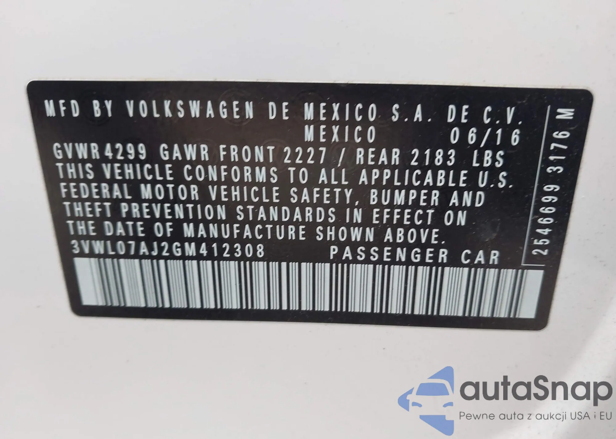 • VIN 3VWL07AJ2GM412308
