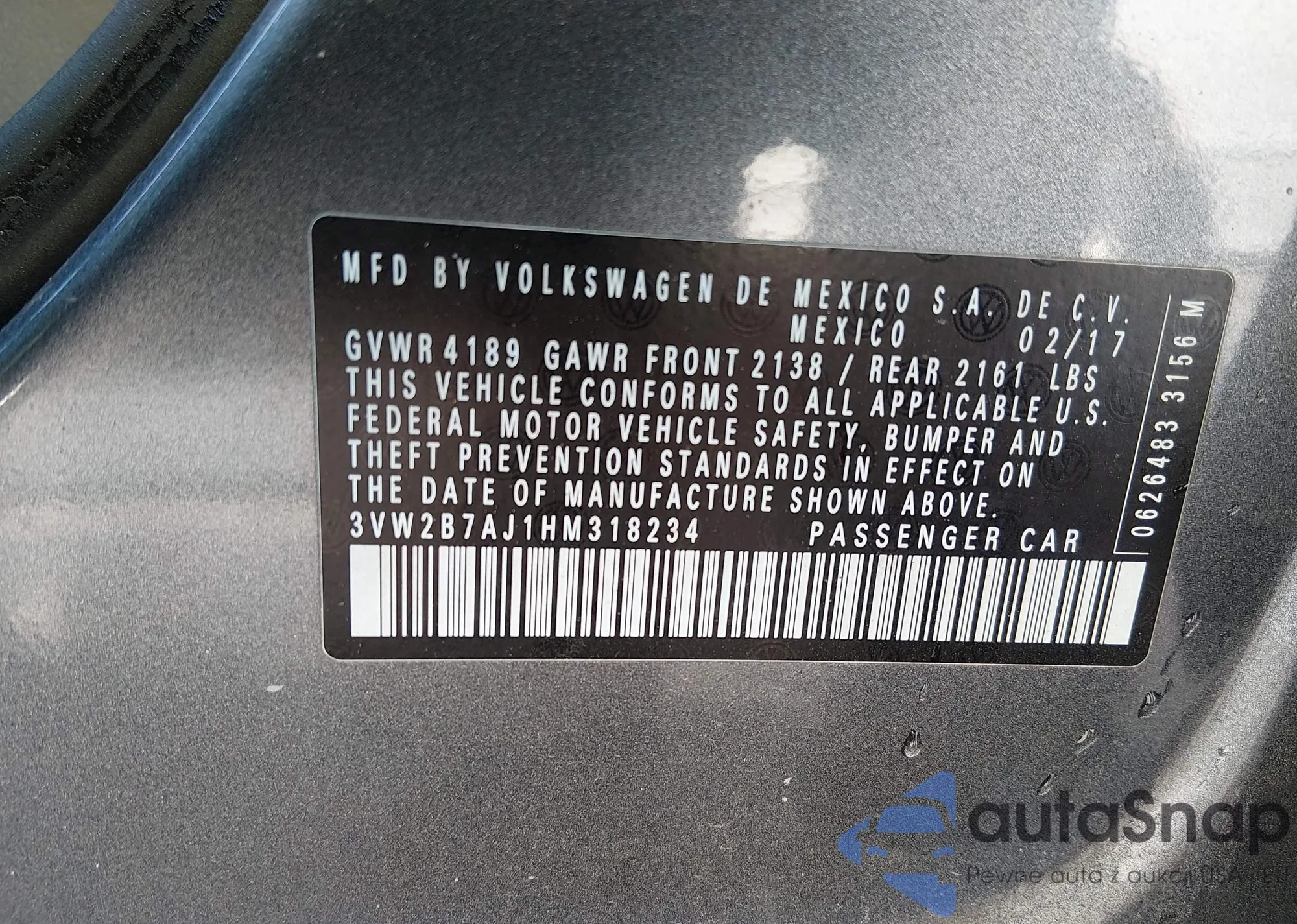 • VIN 3VW2B7AJ1HM318234