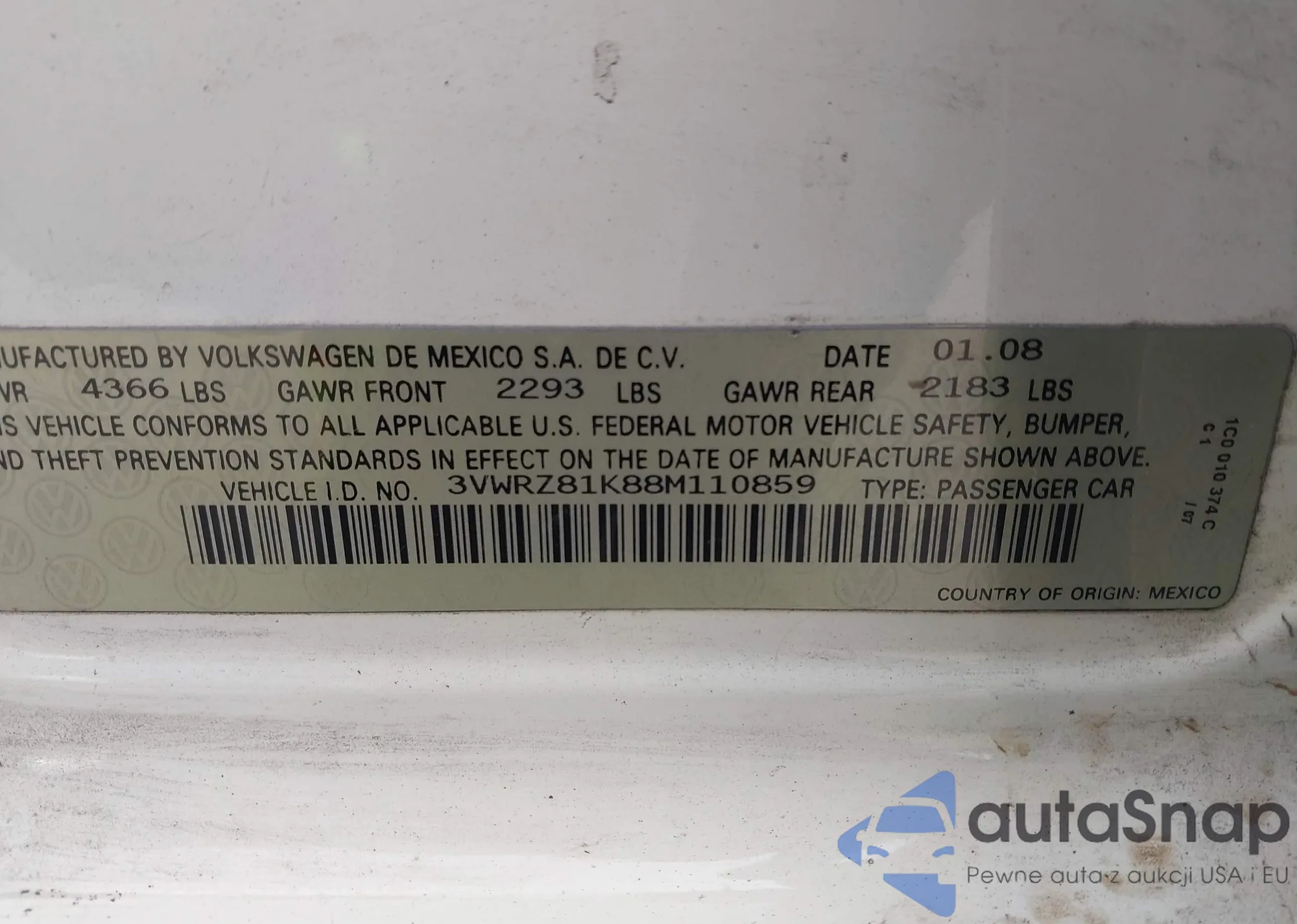 • VIN 3VWRZ81K88M110859