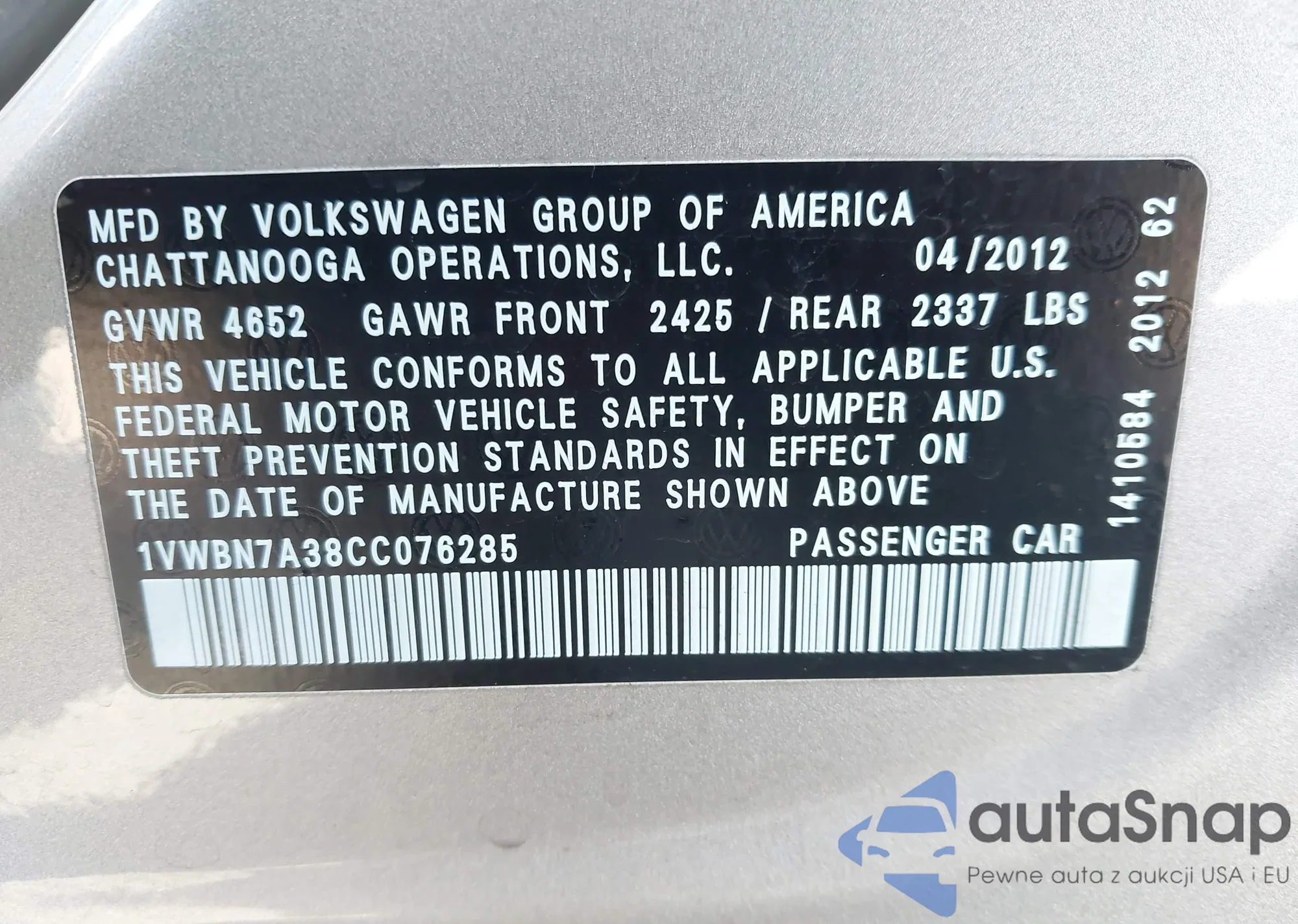 • VIN 1VWBN7A38CC076285