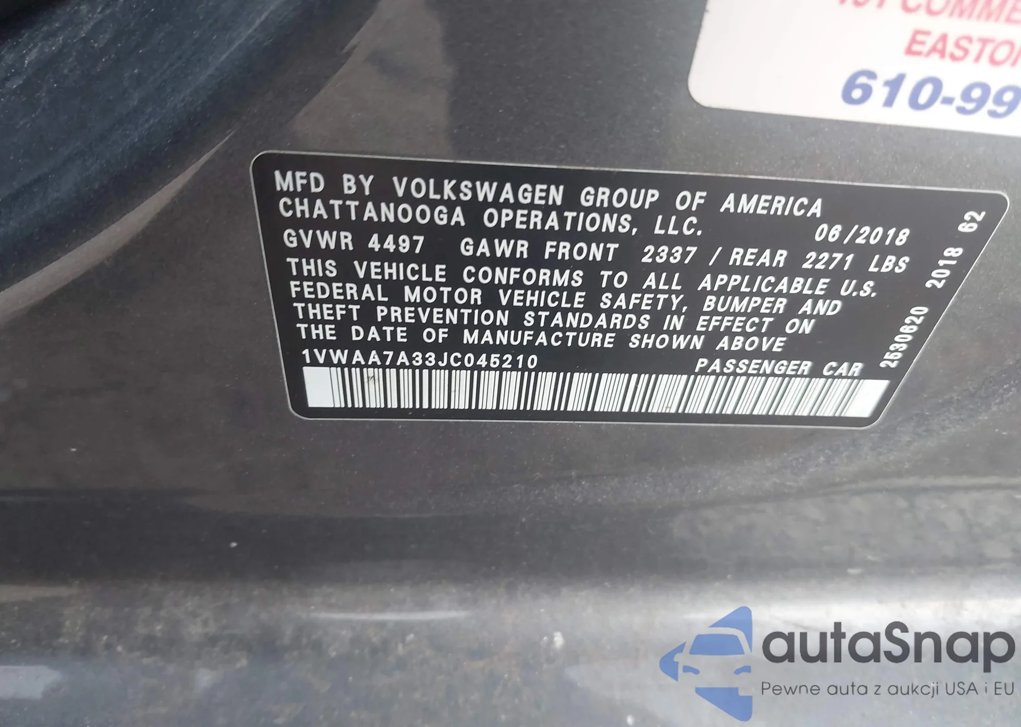 LOT: 44550423 VIN: 1VWAA7A36JC029101