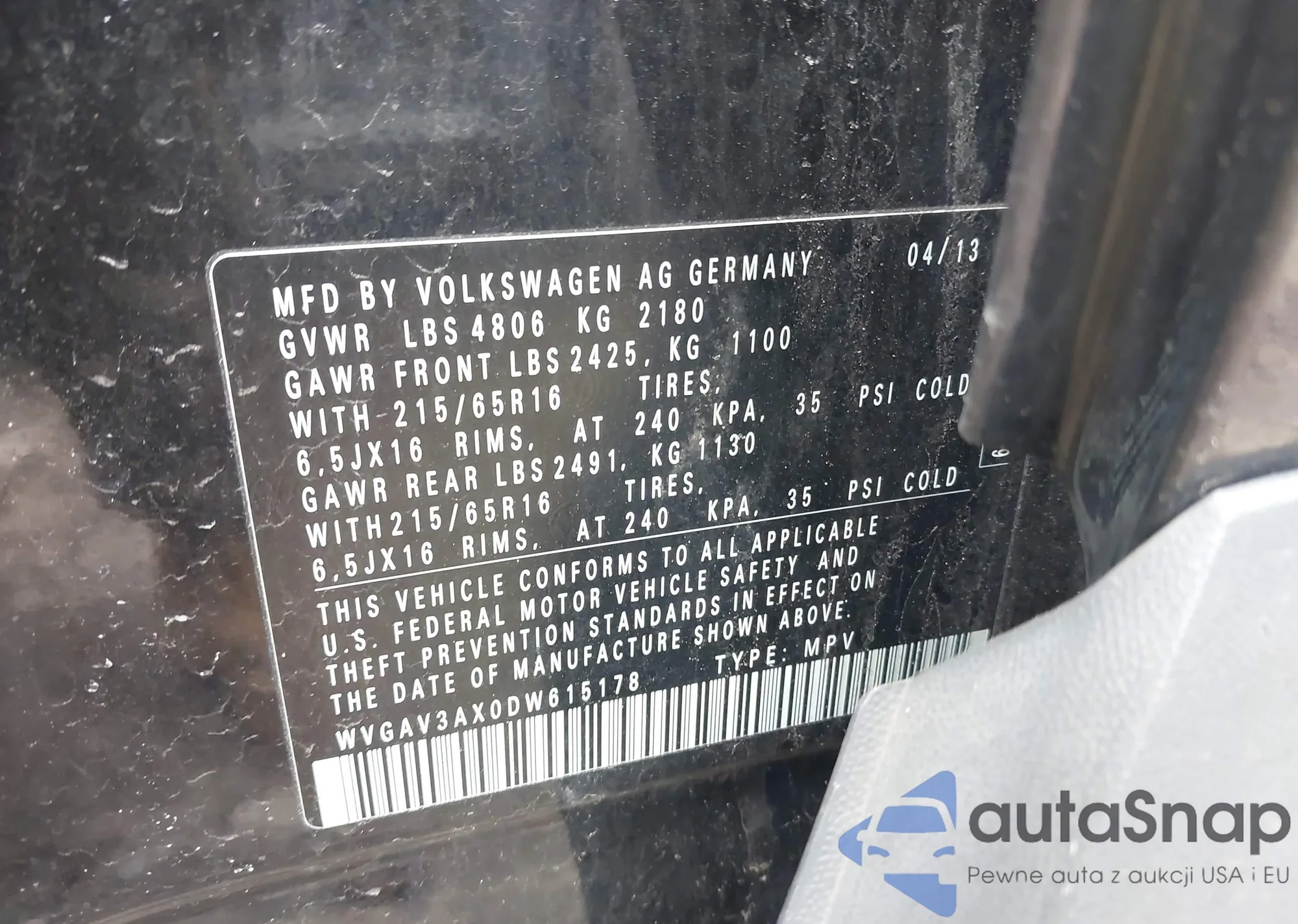 • VIN WVGAV3AX0DW615178