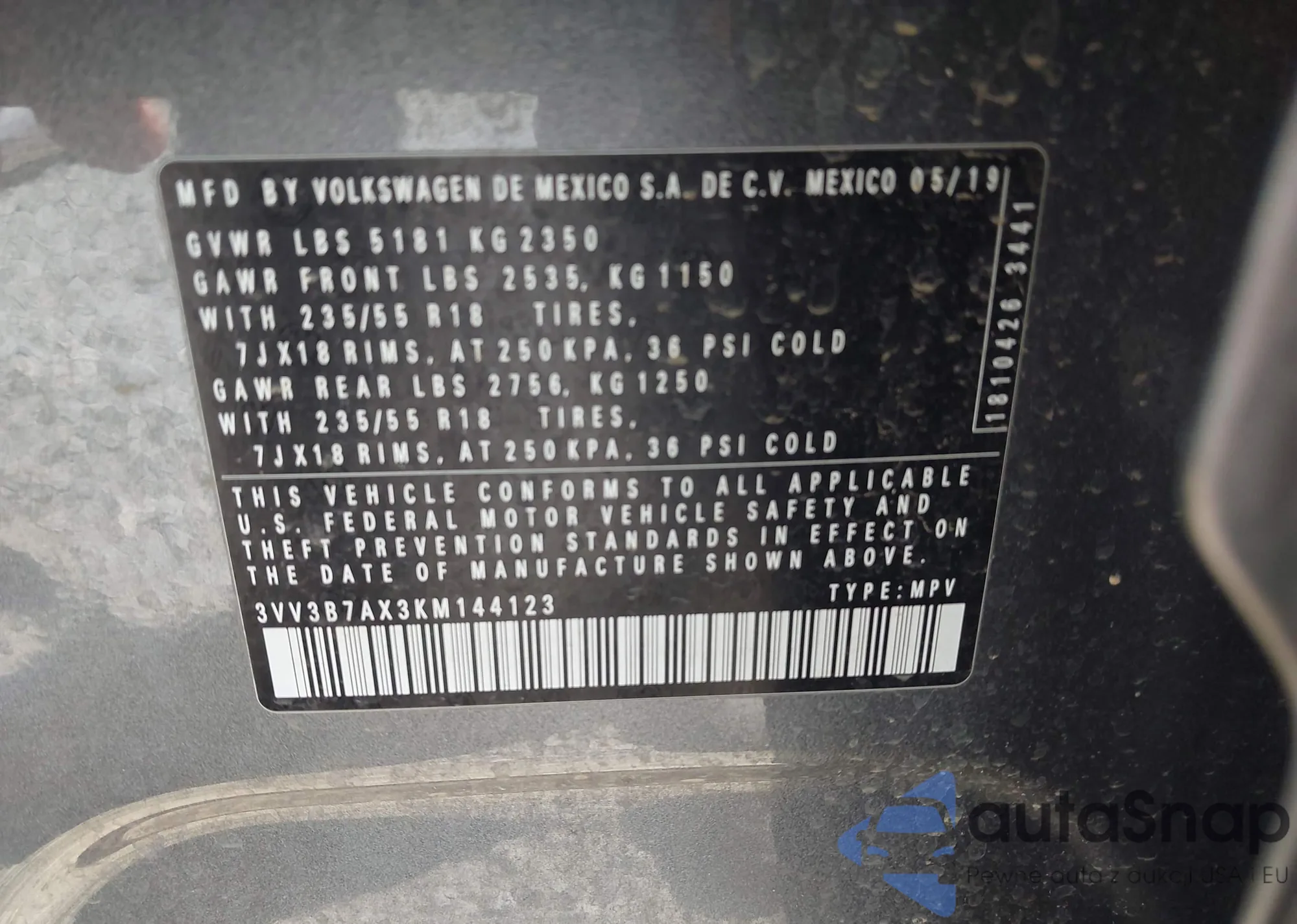 • VIN 3VV3B7AX3KM144123