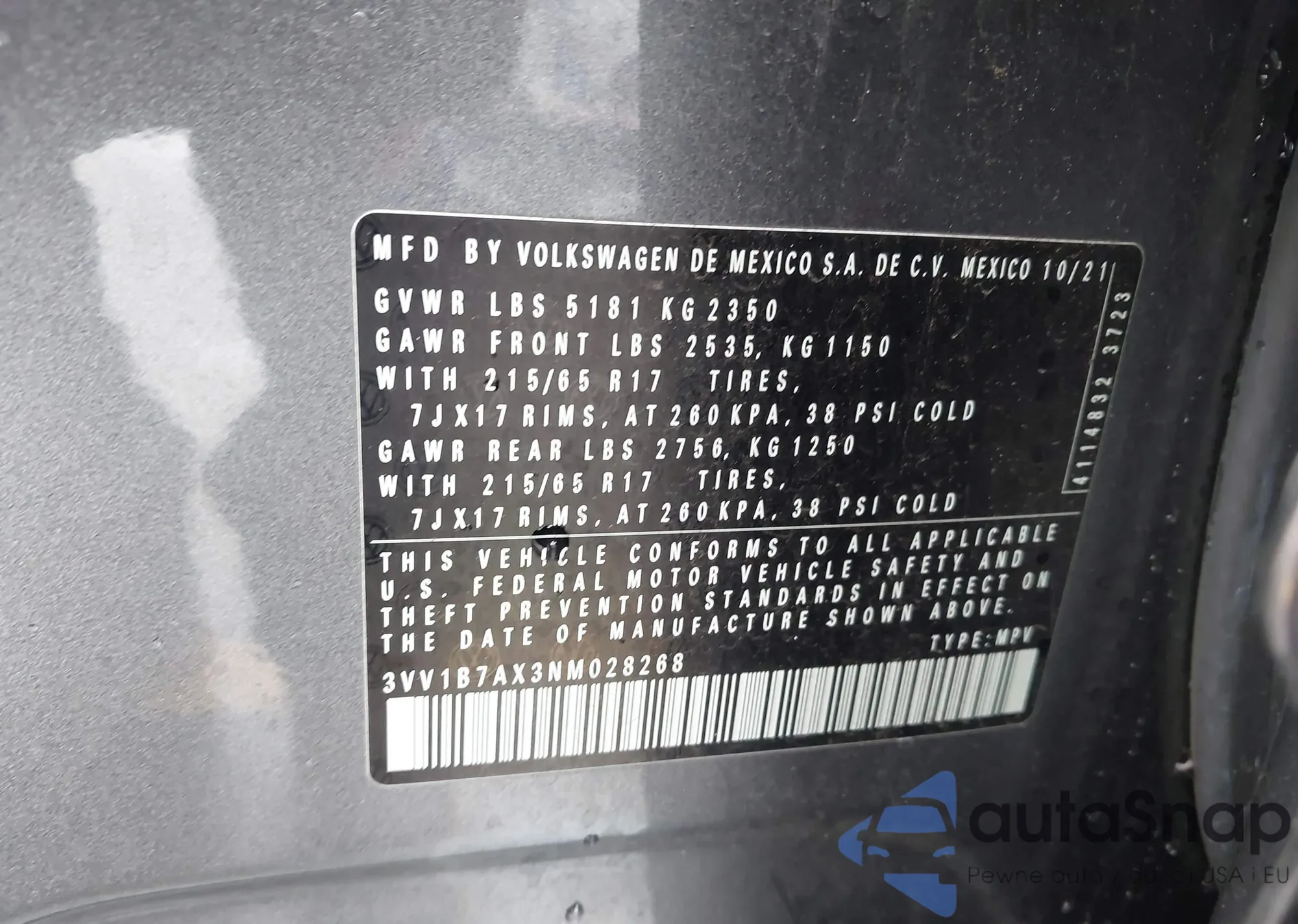 • VIN 3VV1B7AX3NM028268